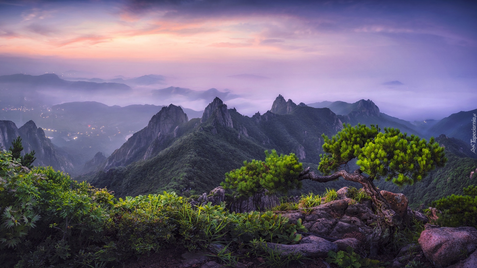 Edytor tapety: Zielona sosna na skałach na tle zamglonych gór