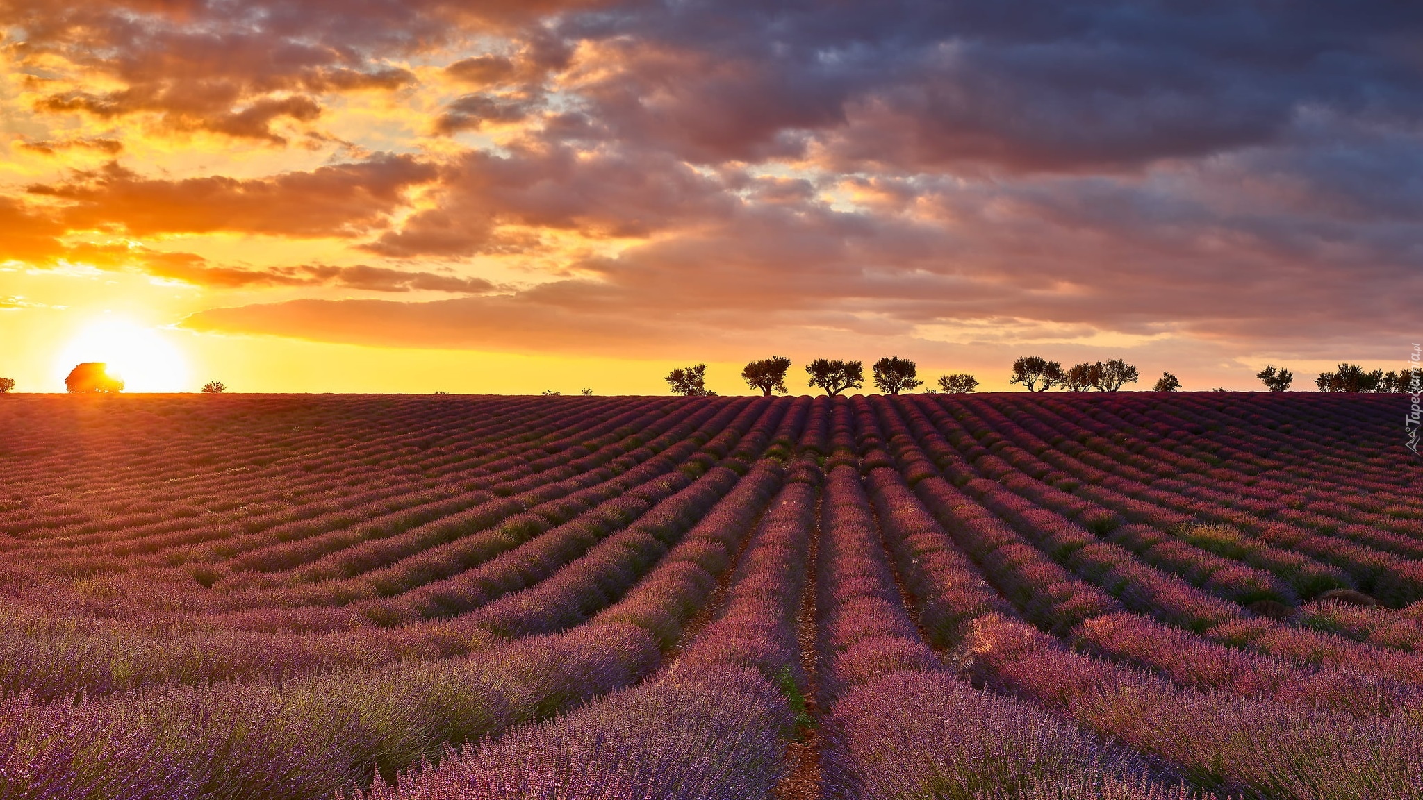 Edytor tapety: Drzewa i pole lawendy w blasku zachodzącego słońca