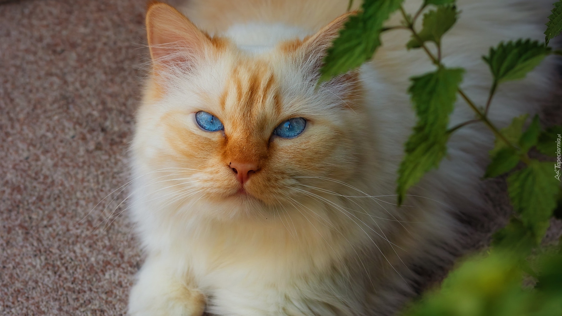 Edytor tapety: Niebieskooki biało-rudy kot obok liści