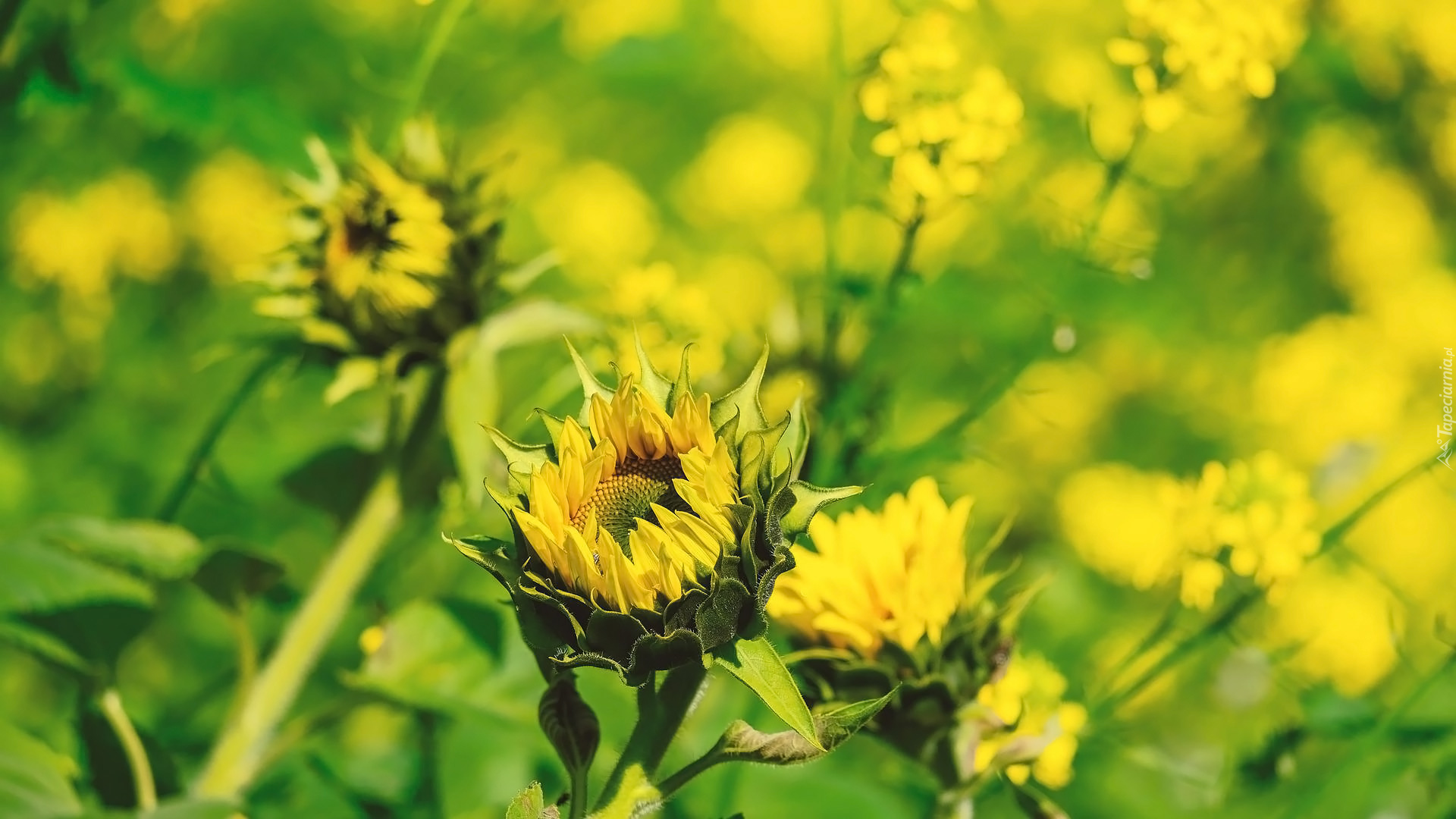 Edytor tapety: Rozkwitające słoneczniki na rozmytym tle
