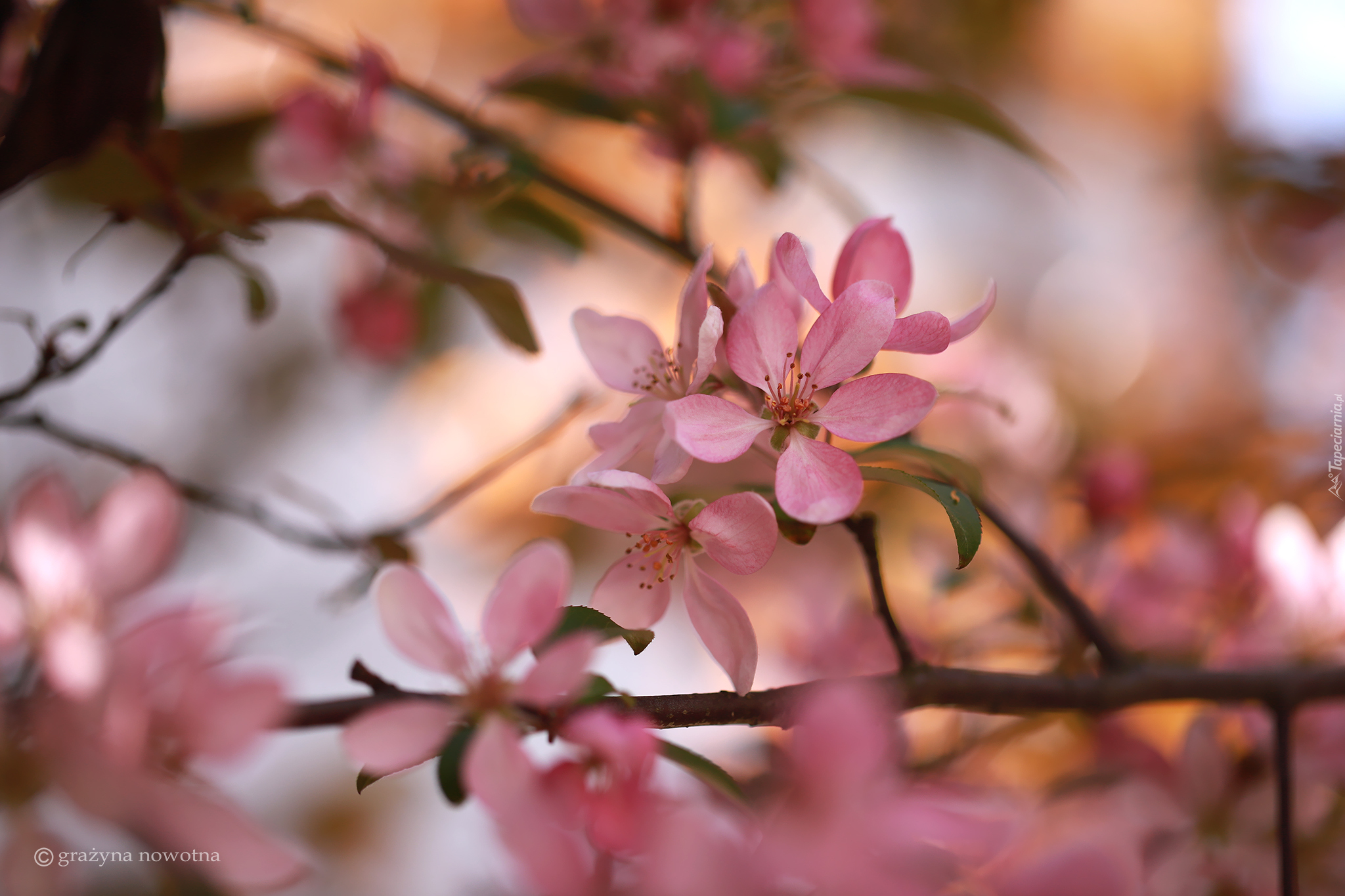 Edytor tapety: Różowe kwiaty rajskiej jabłoni na gałązce