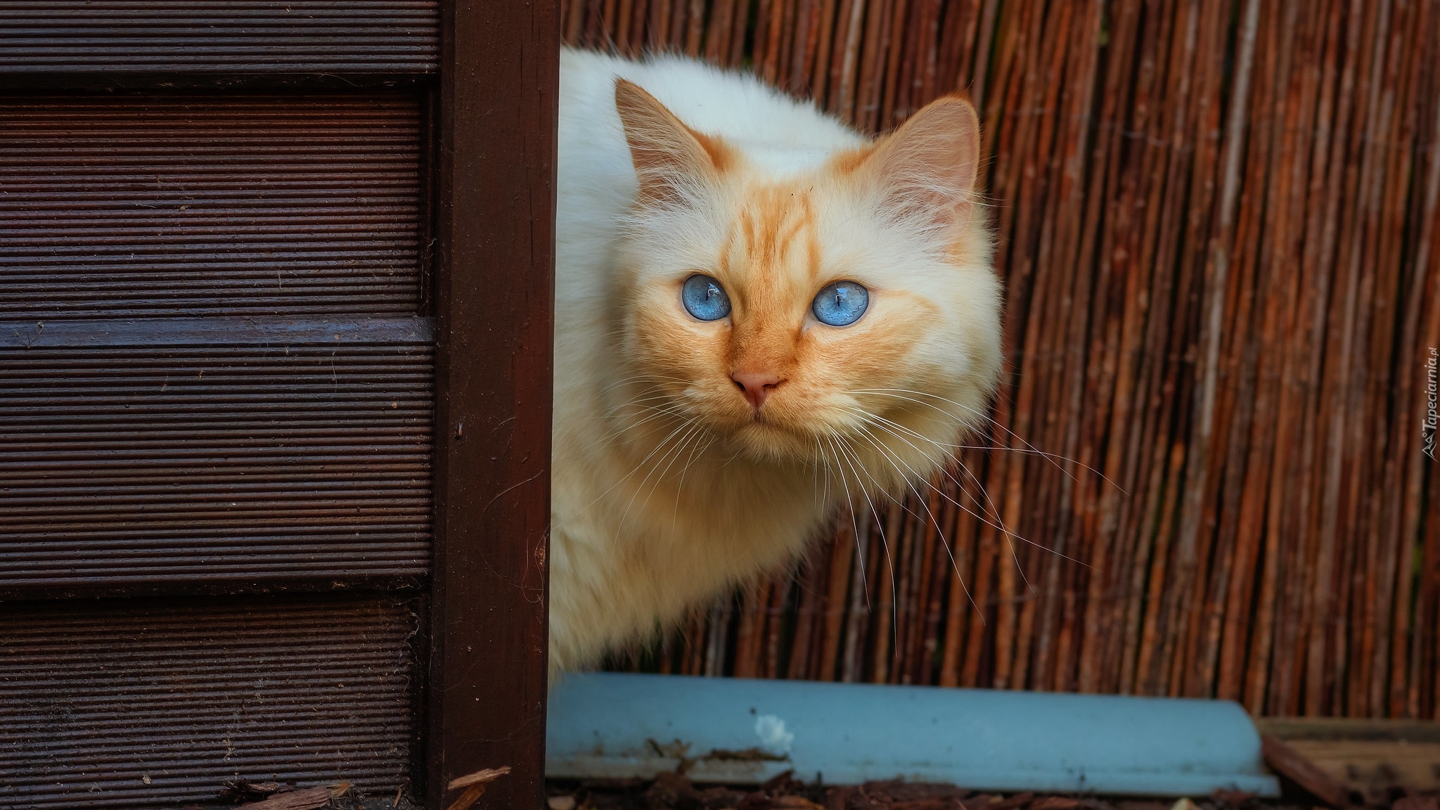 Edytor tapety: Niebieskooki kot za drzwiami w ogrodzie