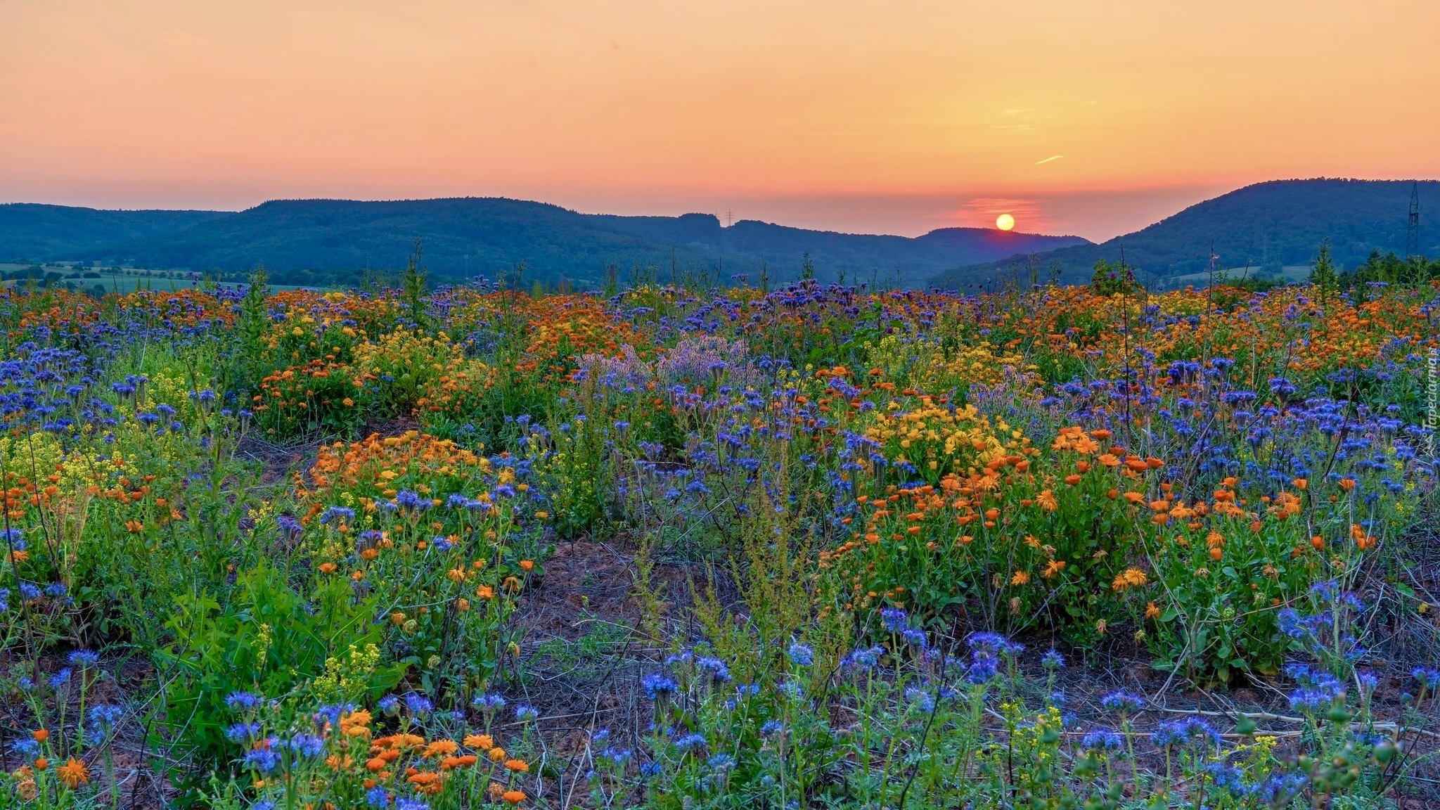 Edytor tapety: Polne kwiaty na łące o zachodzie słońca
