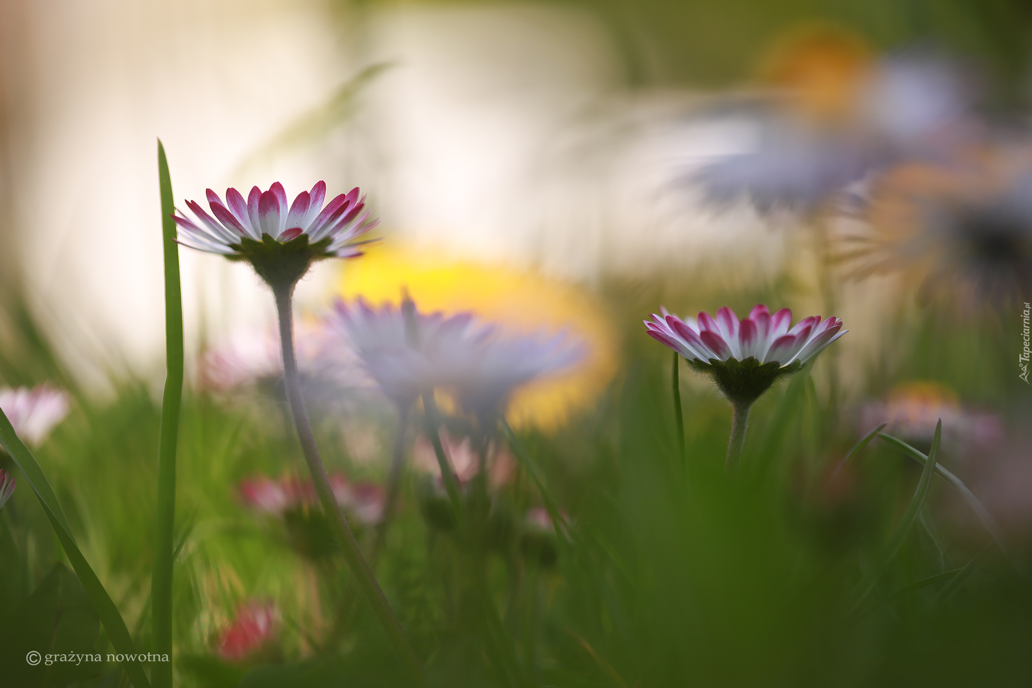 Edytor tapety: Biało-różowe stokrotki na rozmytym tle