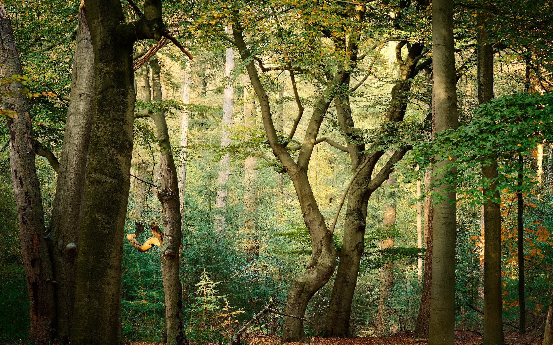 Edytor tapety: Rozświetlone słońcem drzewa w lesie liściastym