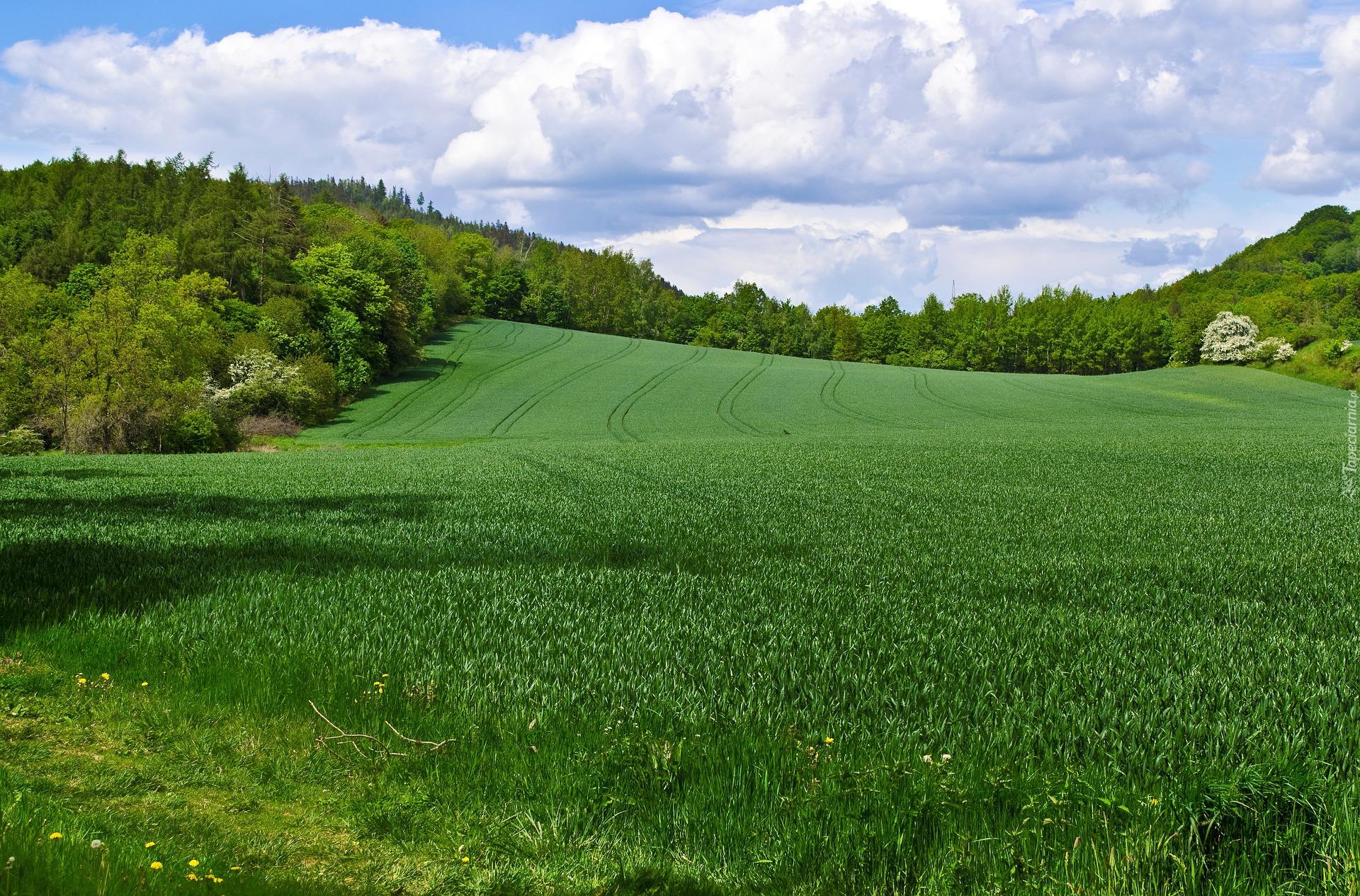 Edytor tapety: Zielone pola uprawne na wzgórzu pod lasem