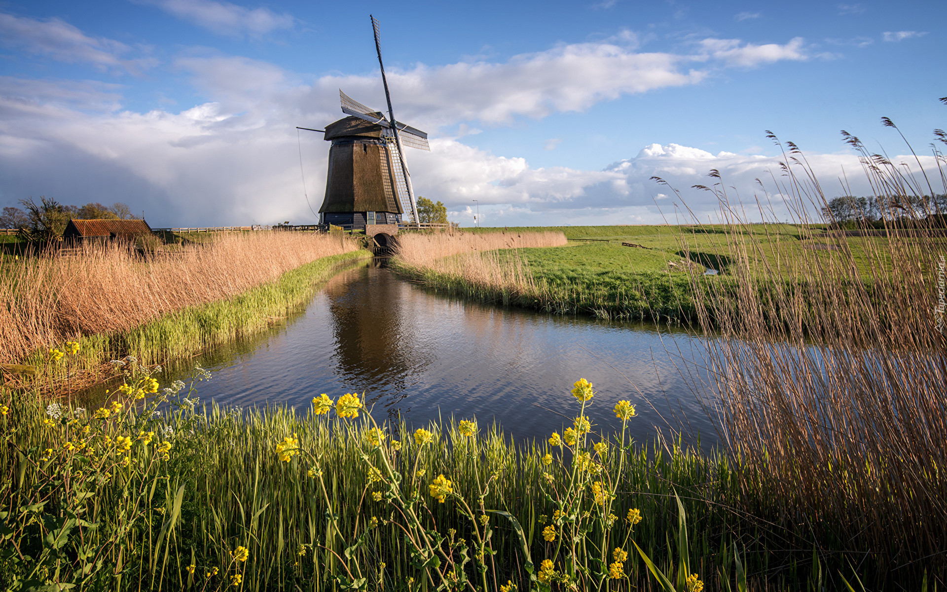 Edytor tapety: Wiatrak i trawy nad kanałem