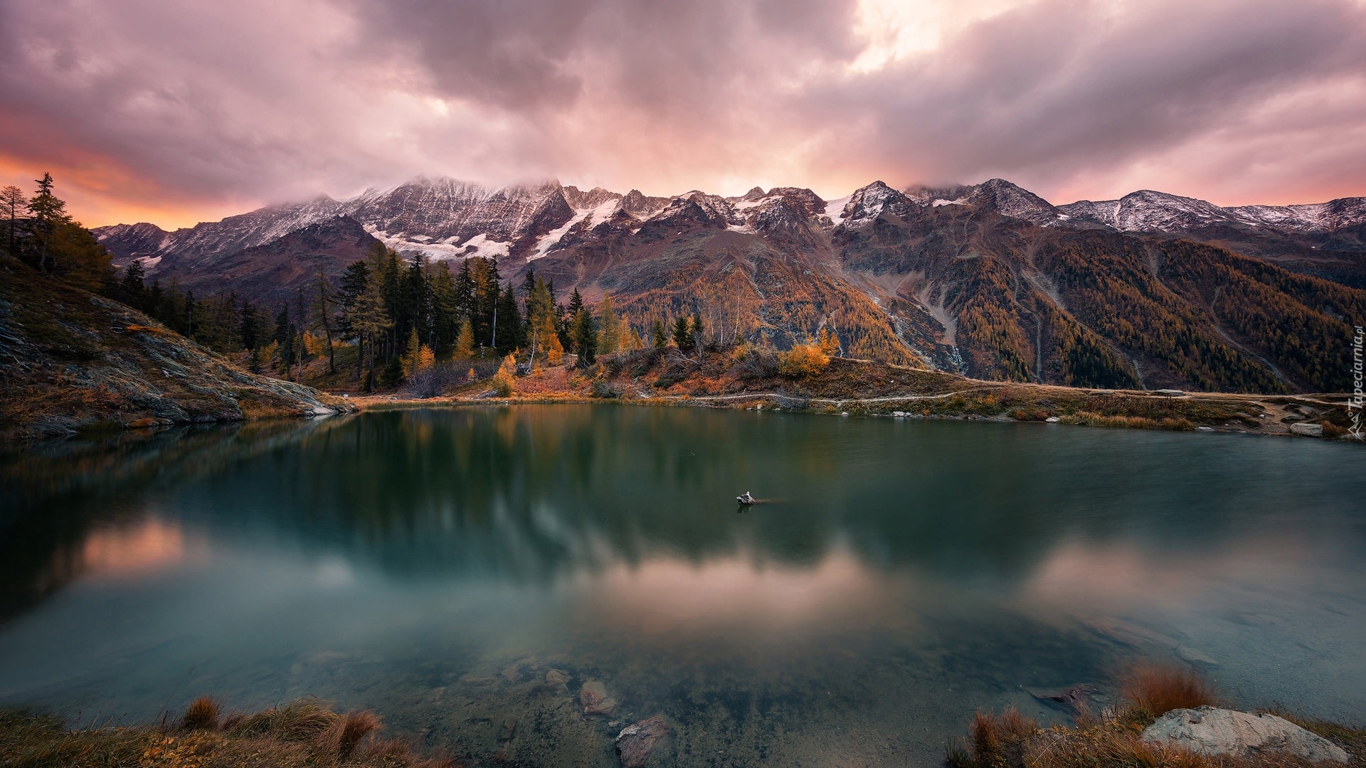 Edytor tapety: Pochmurne niebo nad jeziorem i górami