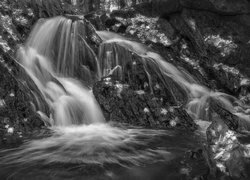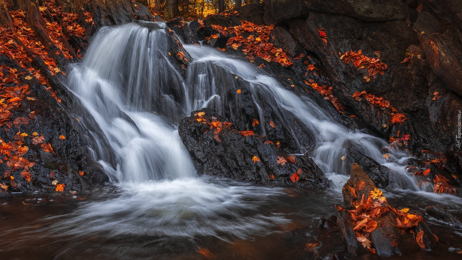 Edytor tapety: Czerwone liście na skałach przy wodospadzie