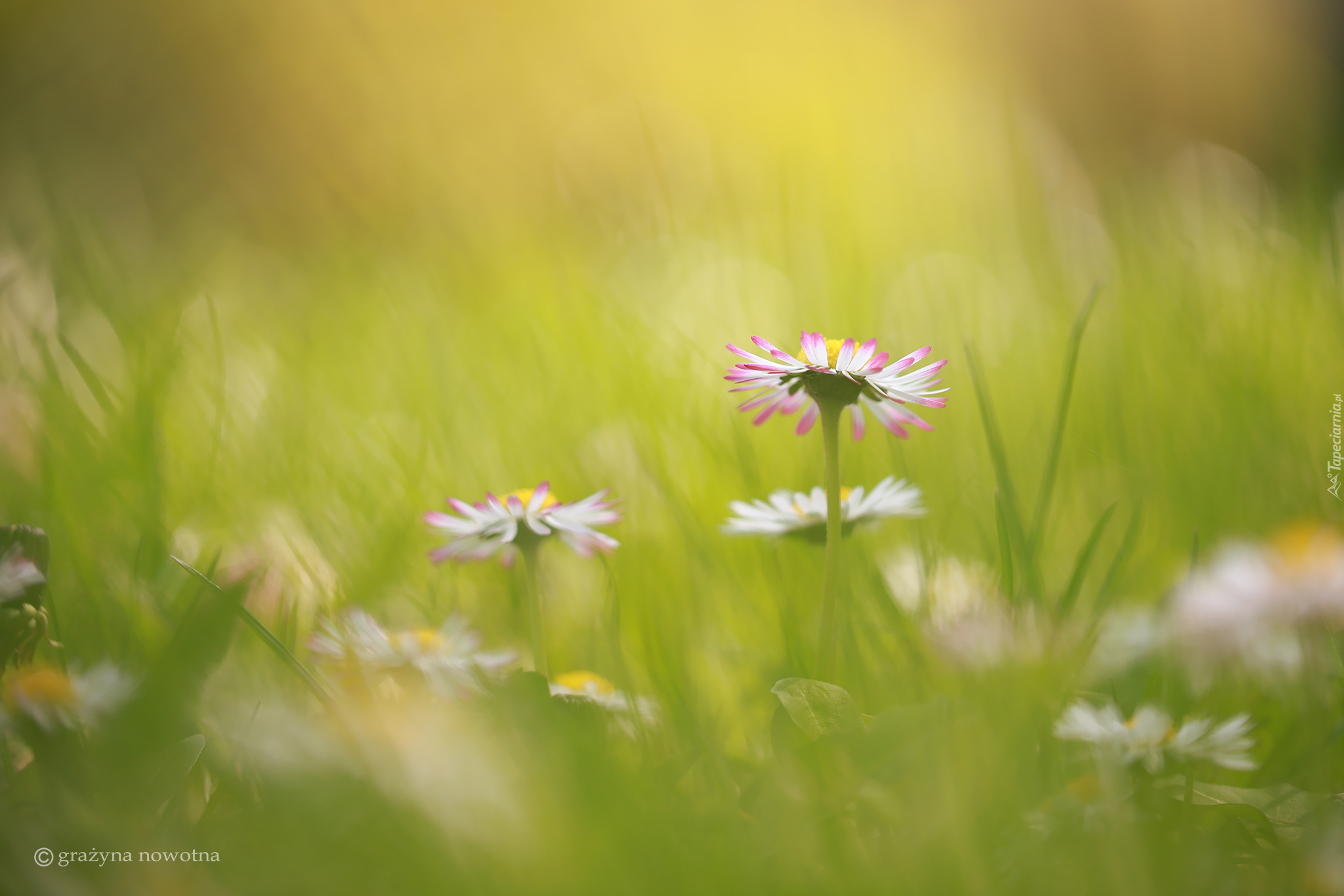 Edytor tapety: Stokrotki w trawie na zielonym rozmytym tle
