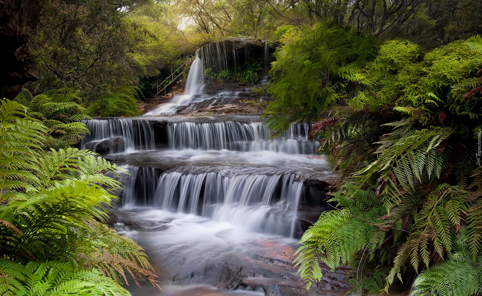 Edytor tapety: Paprocie przy wodospadzie kaskadowym na leśnej rzece