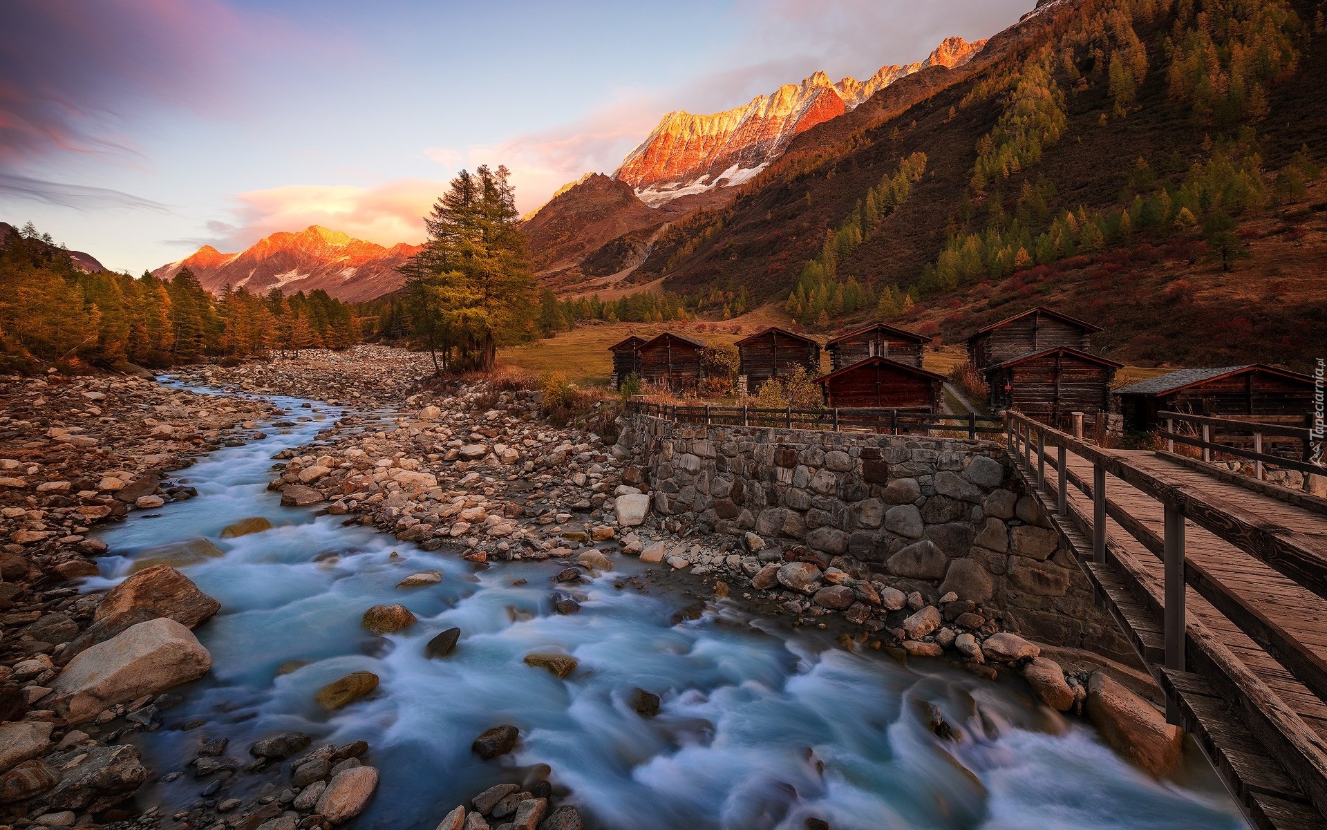 Edytor tapety: Drewniane szopy nad górską rzeką