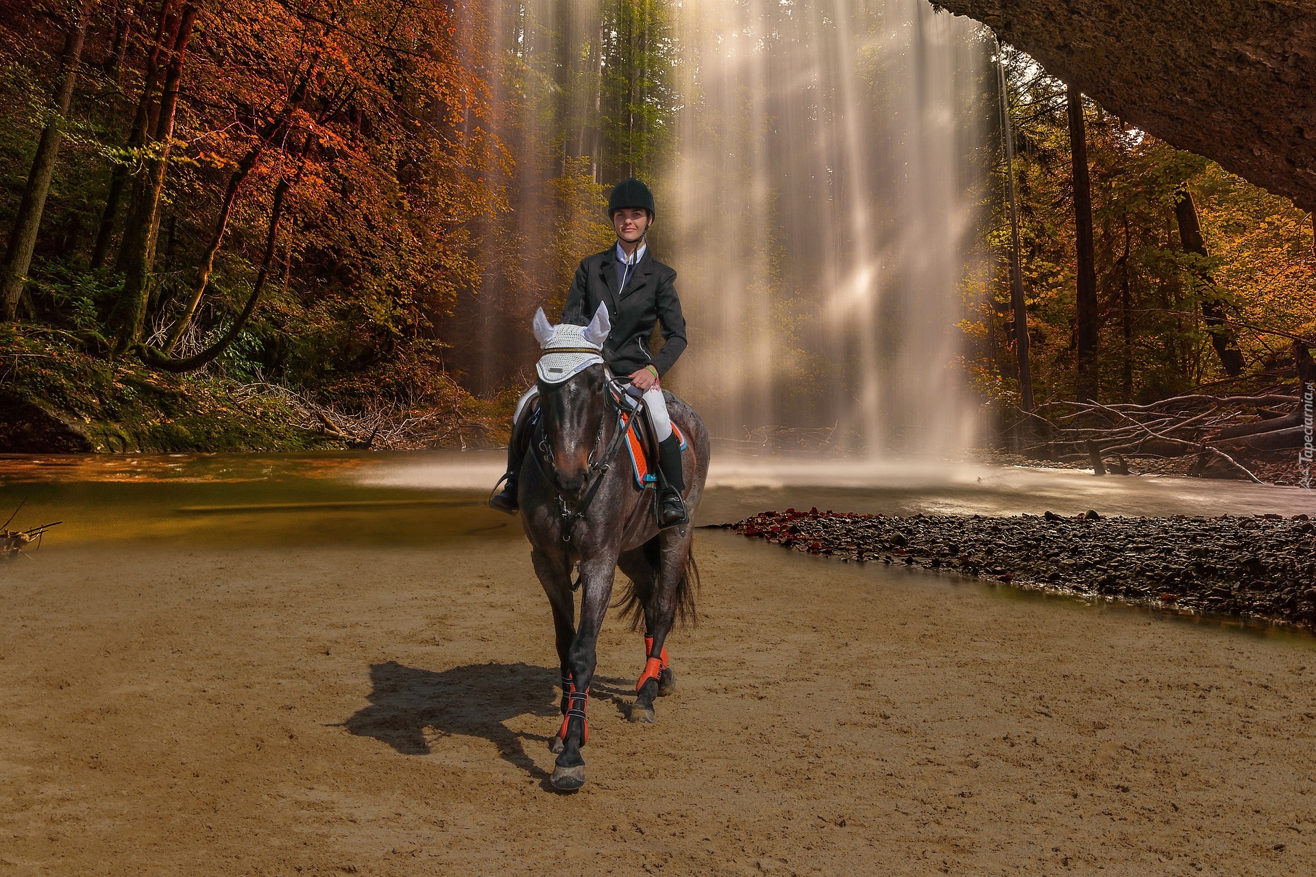 Edytor tapety: Kobieta na koniu na tle wodospadu