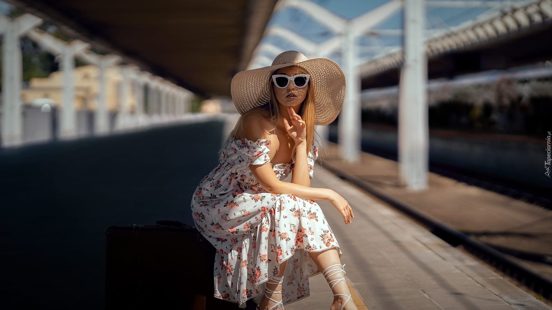 Edytor tapety: Kobieta w kapeluszu i letniej sukience na peronie