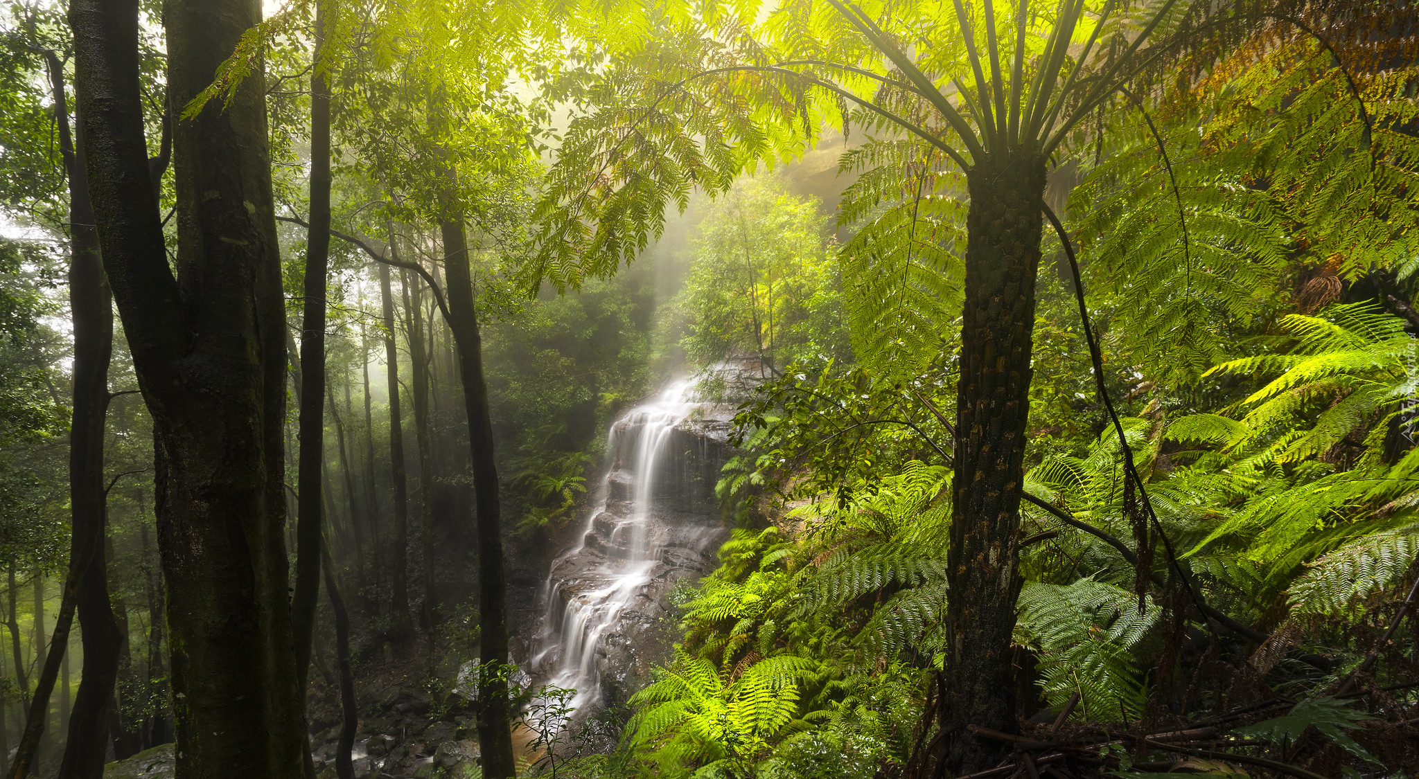 Edytor tapety: Drzewa i paprocie przy wodospadzie