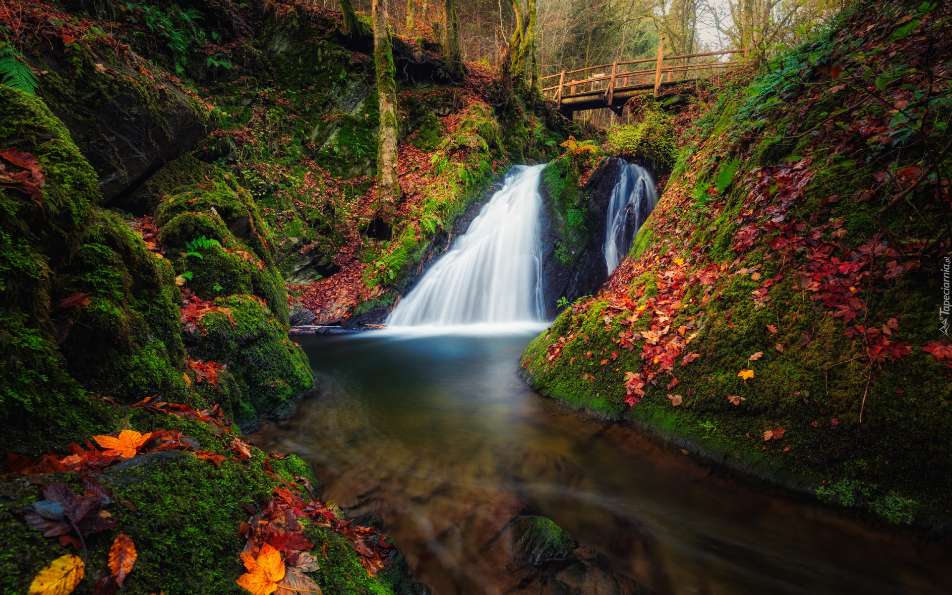 Edytor tapety: Most nad wodospadem wpadającym do rzeki jesienią