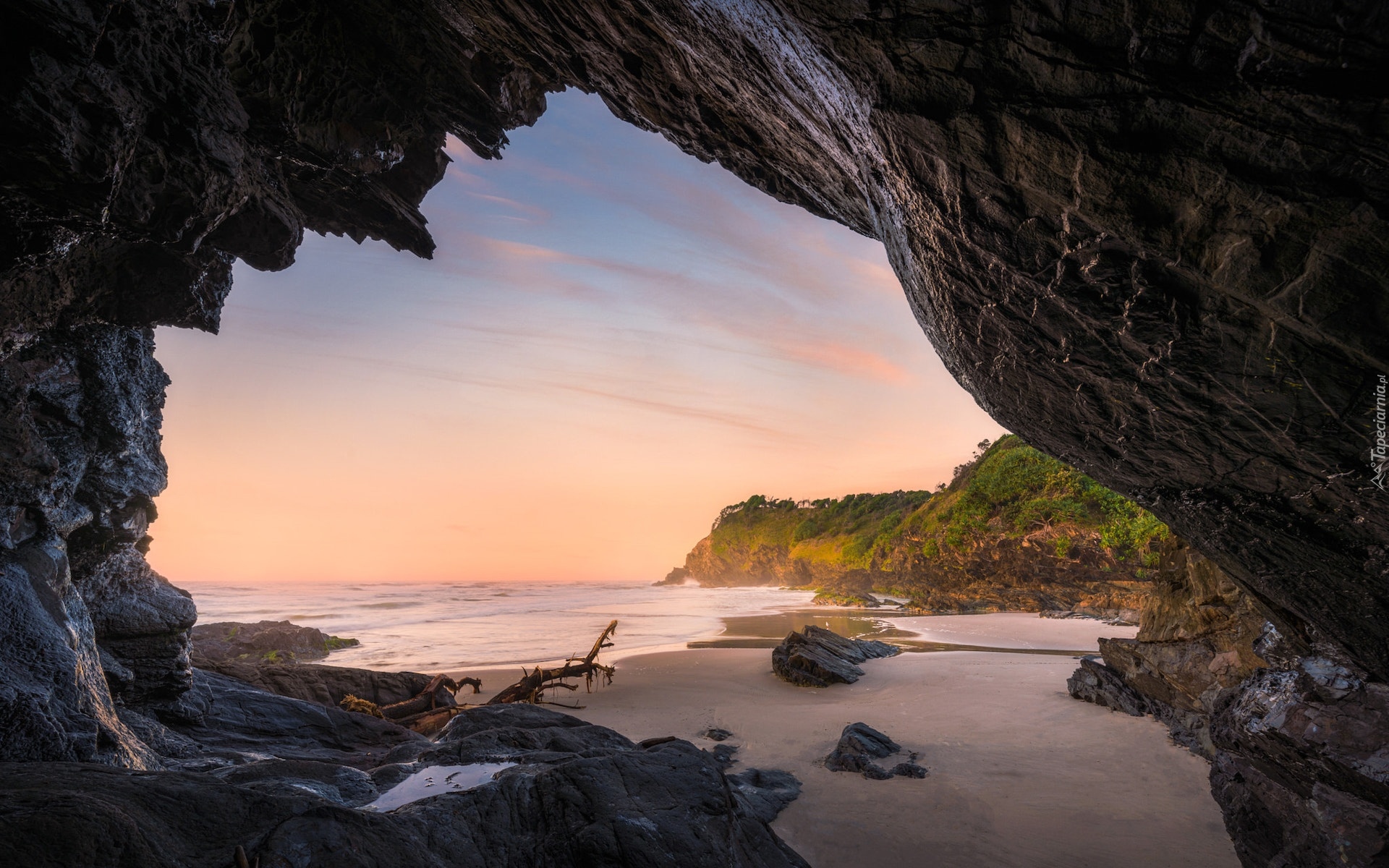Edytor tapety: Widok z jaskini na plażę