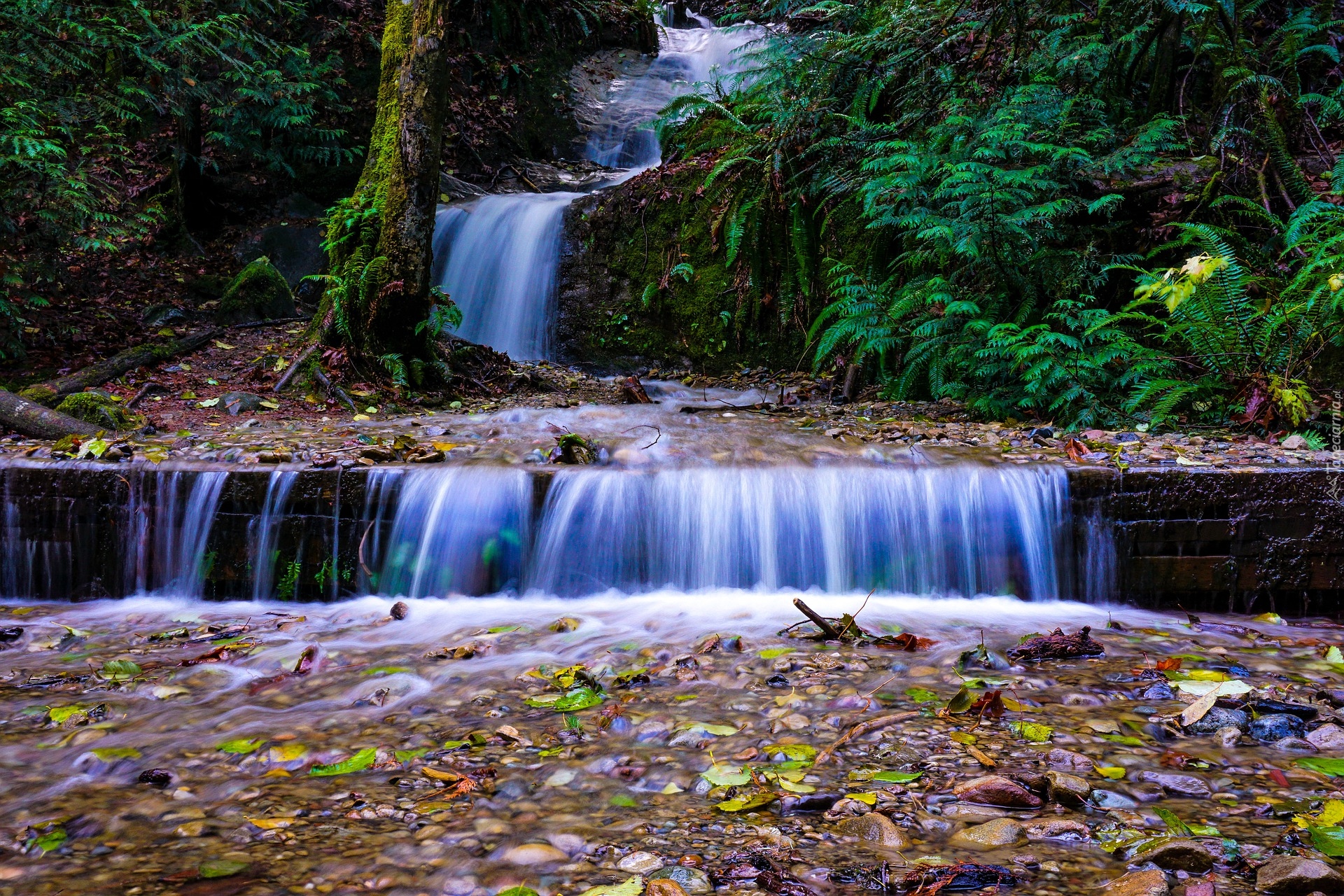 Edytor tapety: Paprocie przy progu skalnym i strumieniu w lesie