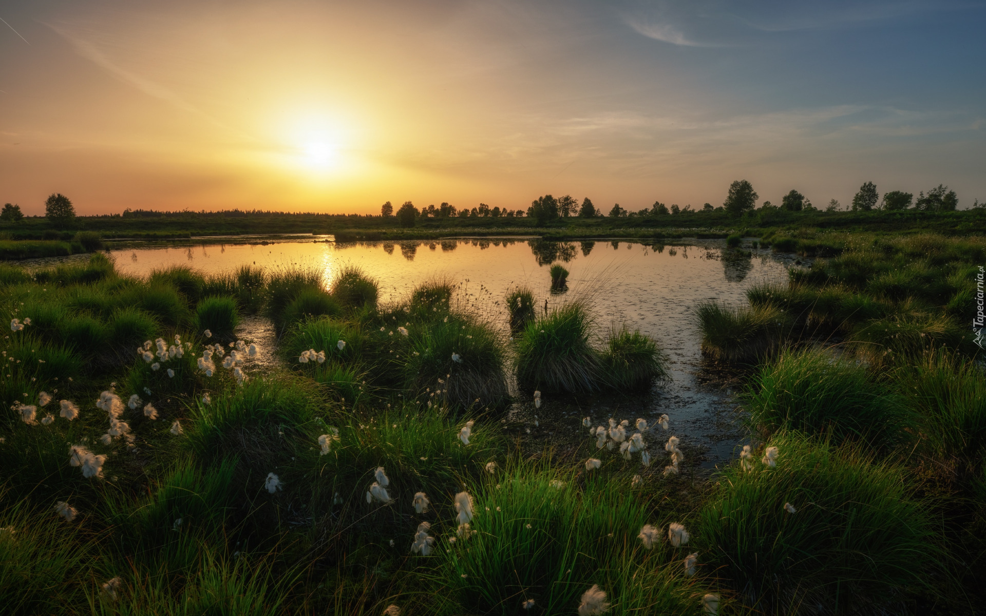 Edytor tapety: Zielona trawa nad stawem o poranku