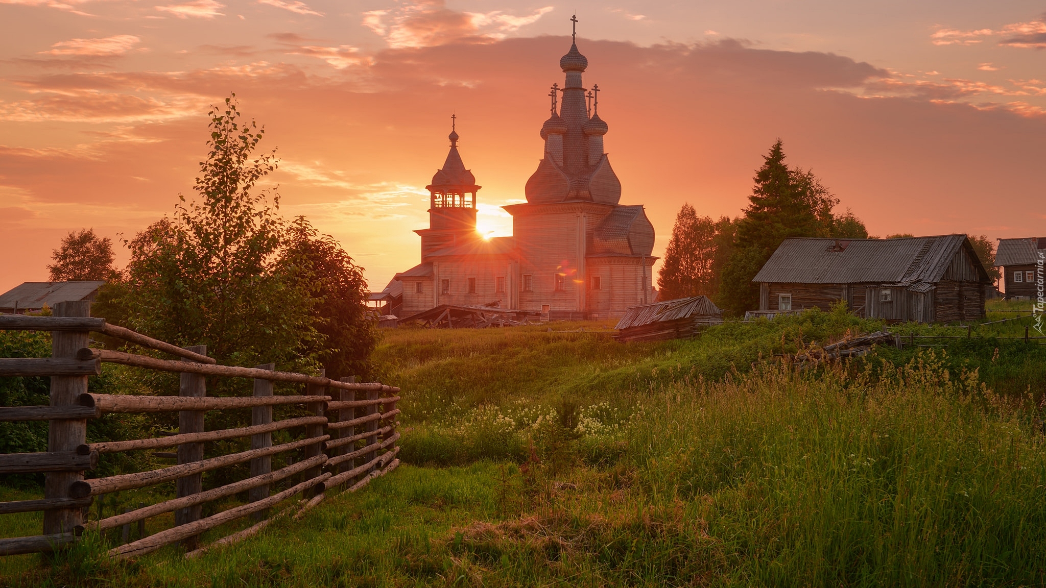 Edytor tapety: Cerkiew i domy na łące o wschodzie słońca
