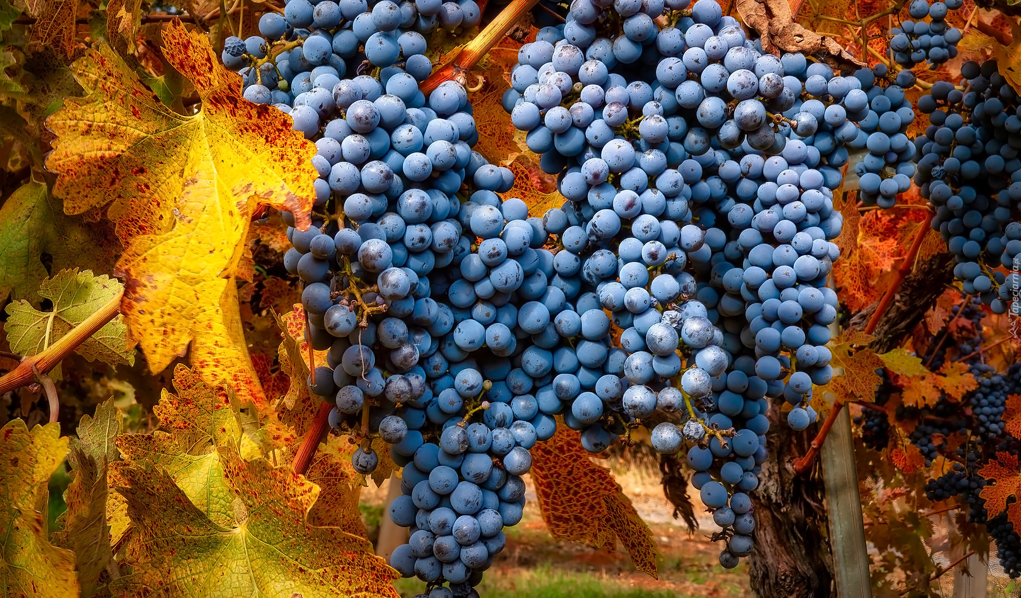 Edytor tapety: Kiście ciemnych winogron na krzewie