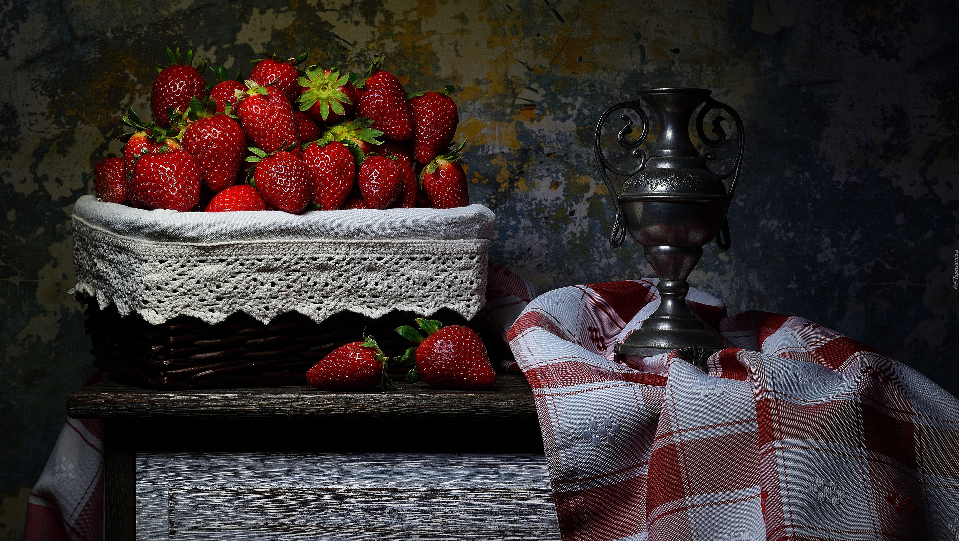 Edytor tapety: Wazon obok truskawek w koszyku na stole