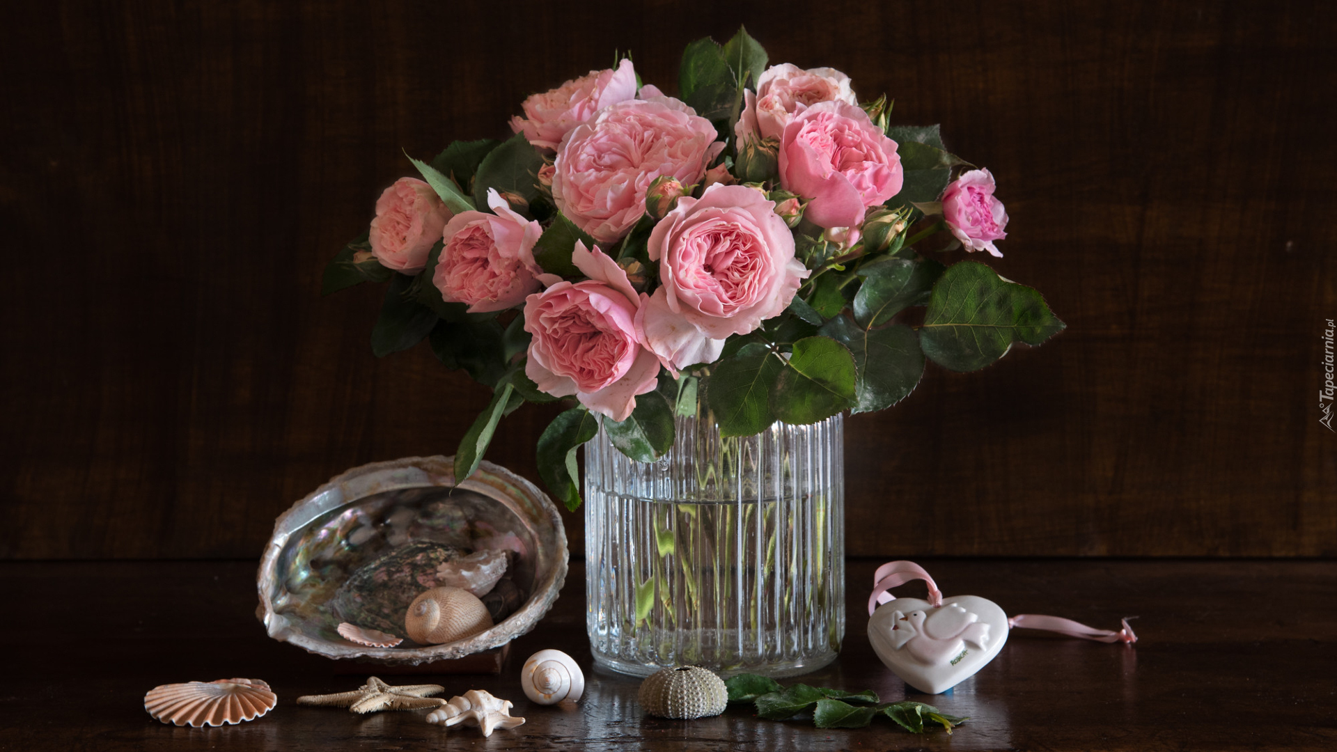 Edytor tapety: Muszelki obok różowych róż w szklanym wazonie