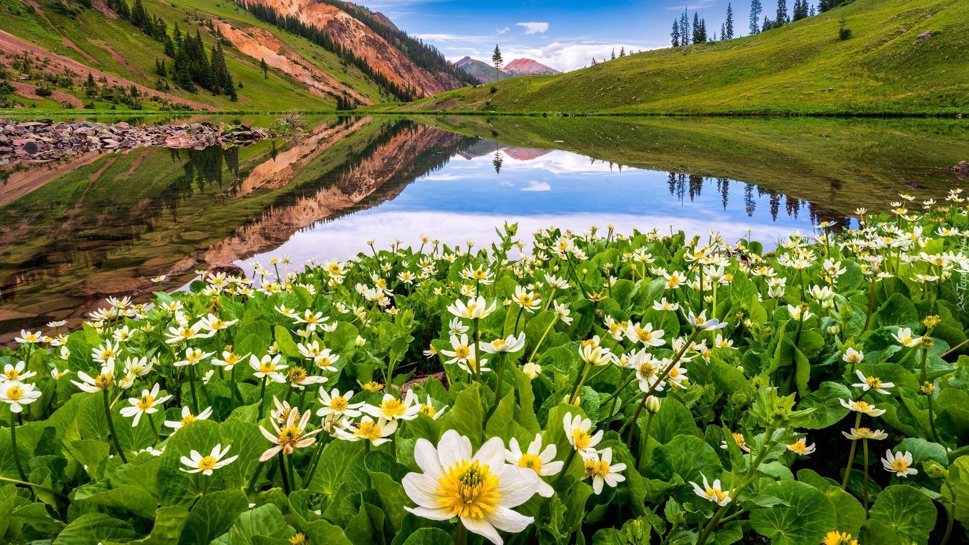 Edytor tapety: Białe kwiaty nad jeziorkiem