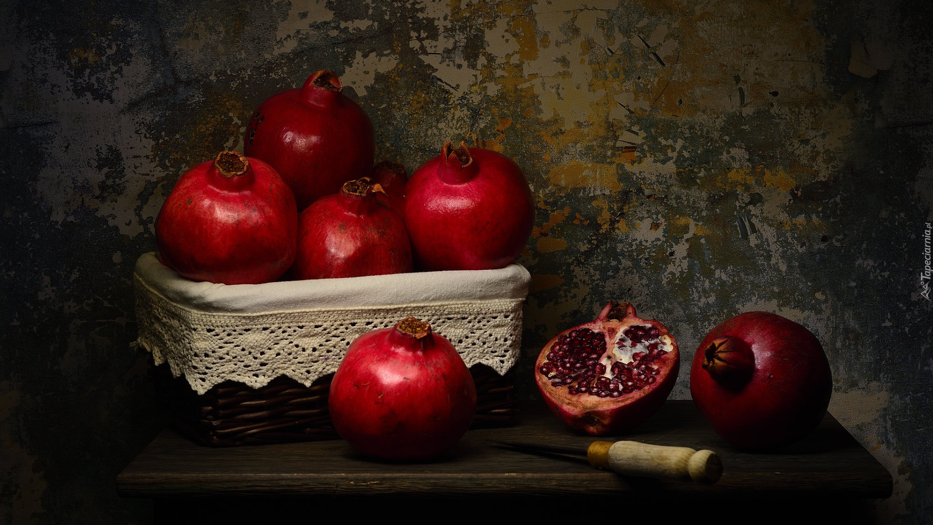 Edytor tapety: Granaty w koszyku i nóż na stole