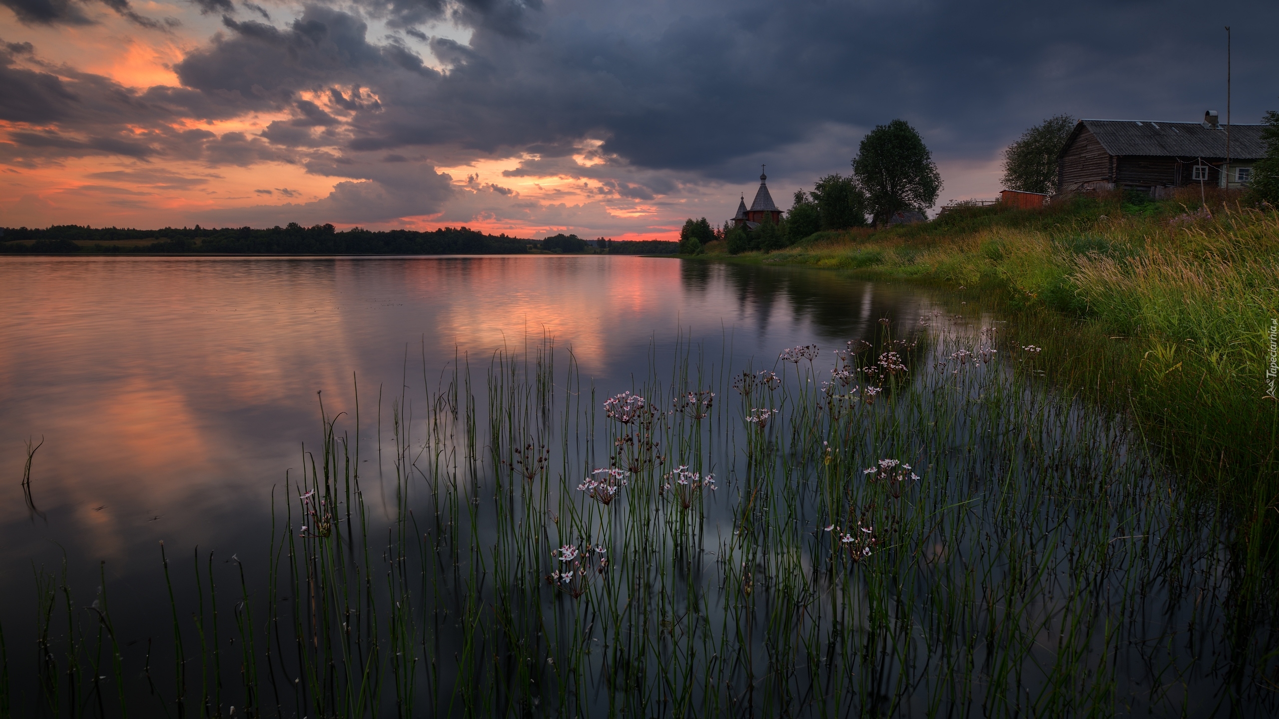 Edytor tapety: Cerkiew i jezioro pod zachmurzonym niebem