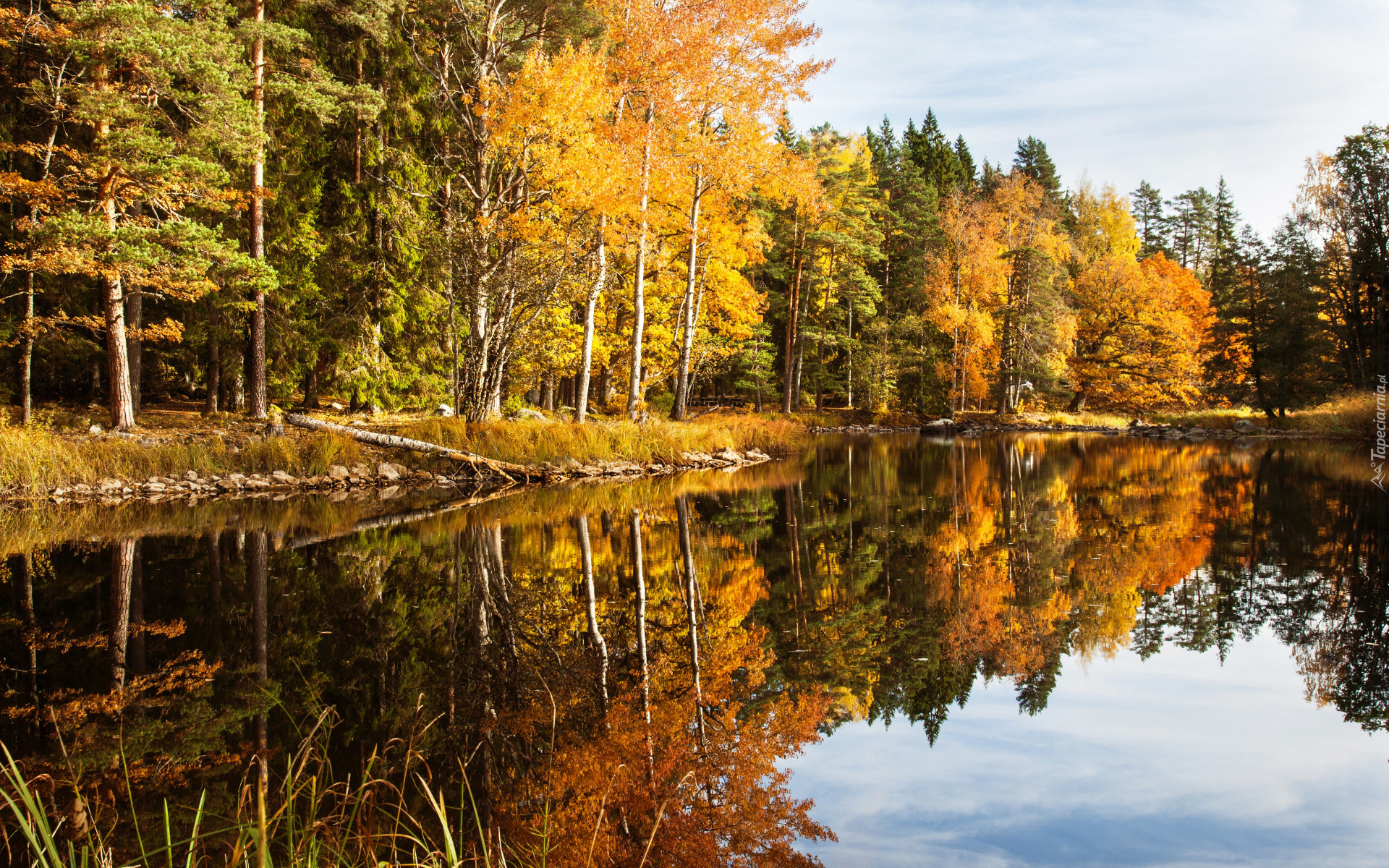 Edytor tapety: Odbicie w jeziorze rozświetlonych słońcem jesiennych drzew