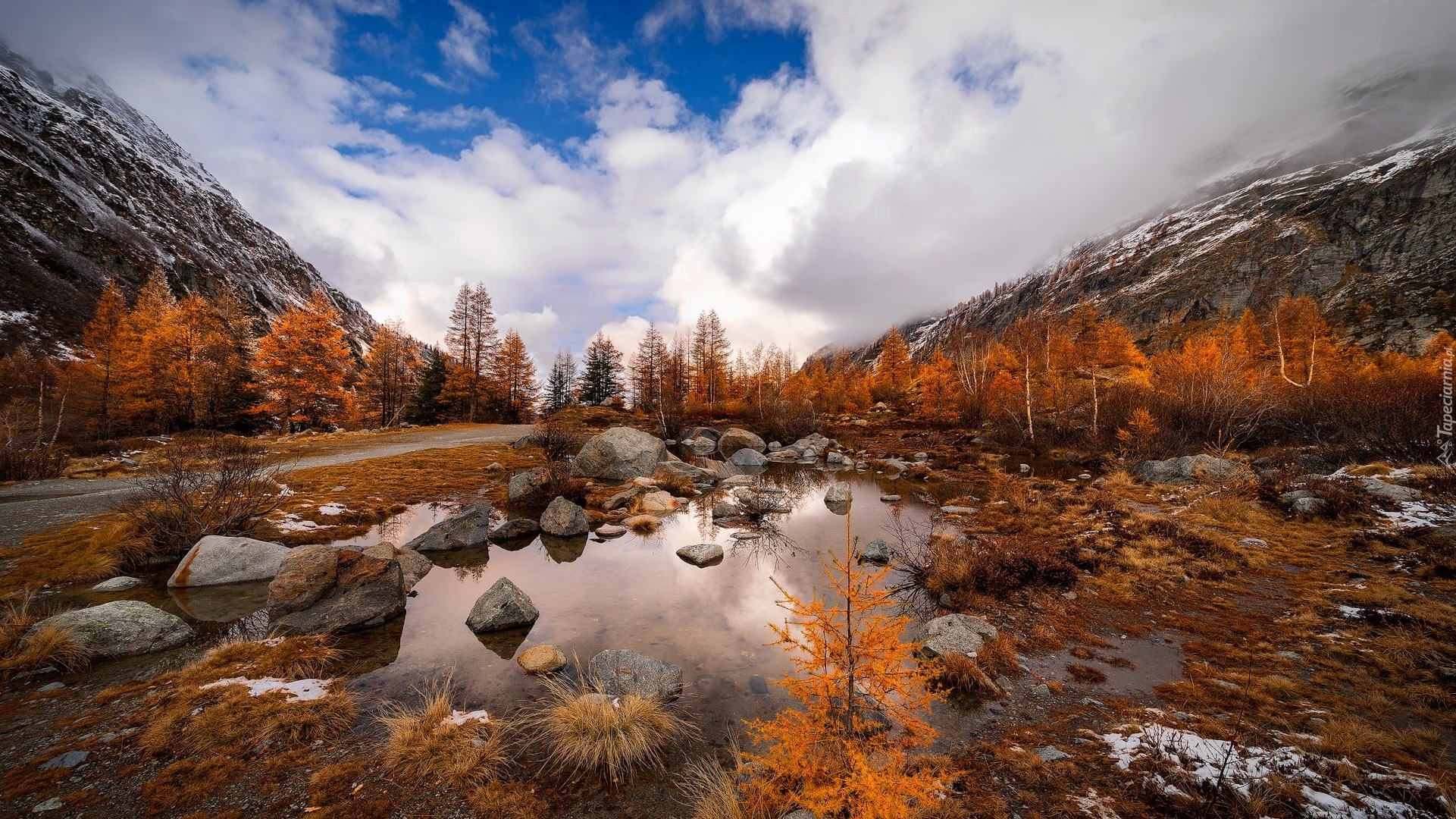 Edytor tapety: Jesienne drzewa w górach pod zachmurzonym niebem