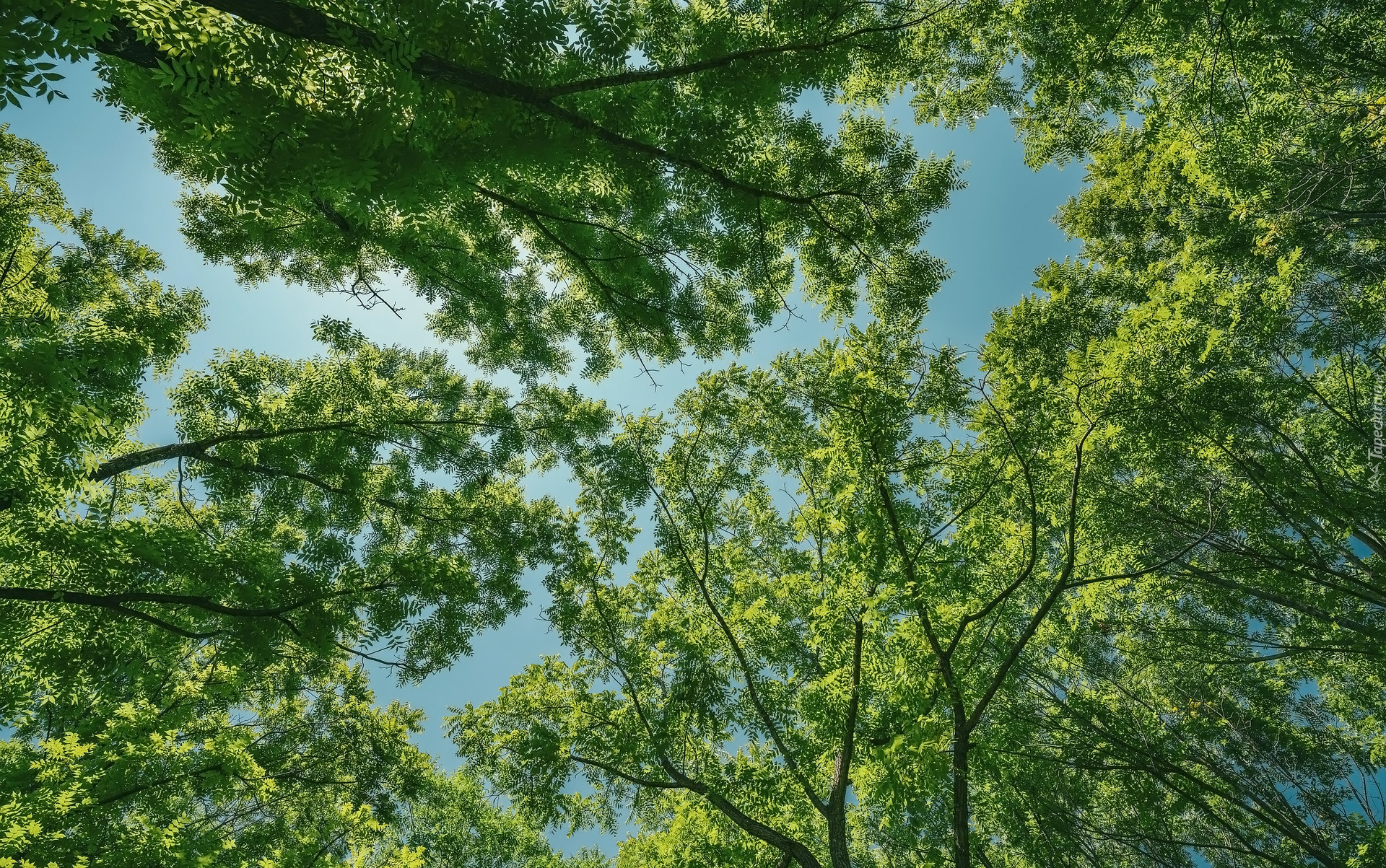 Edytor tapety: Wierzchołki zielonych drzew na tle niebieskiego nieba
