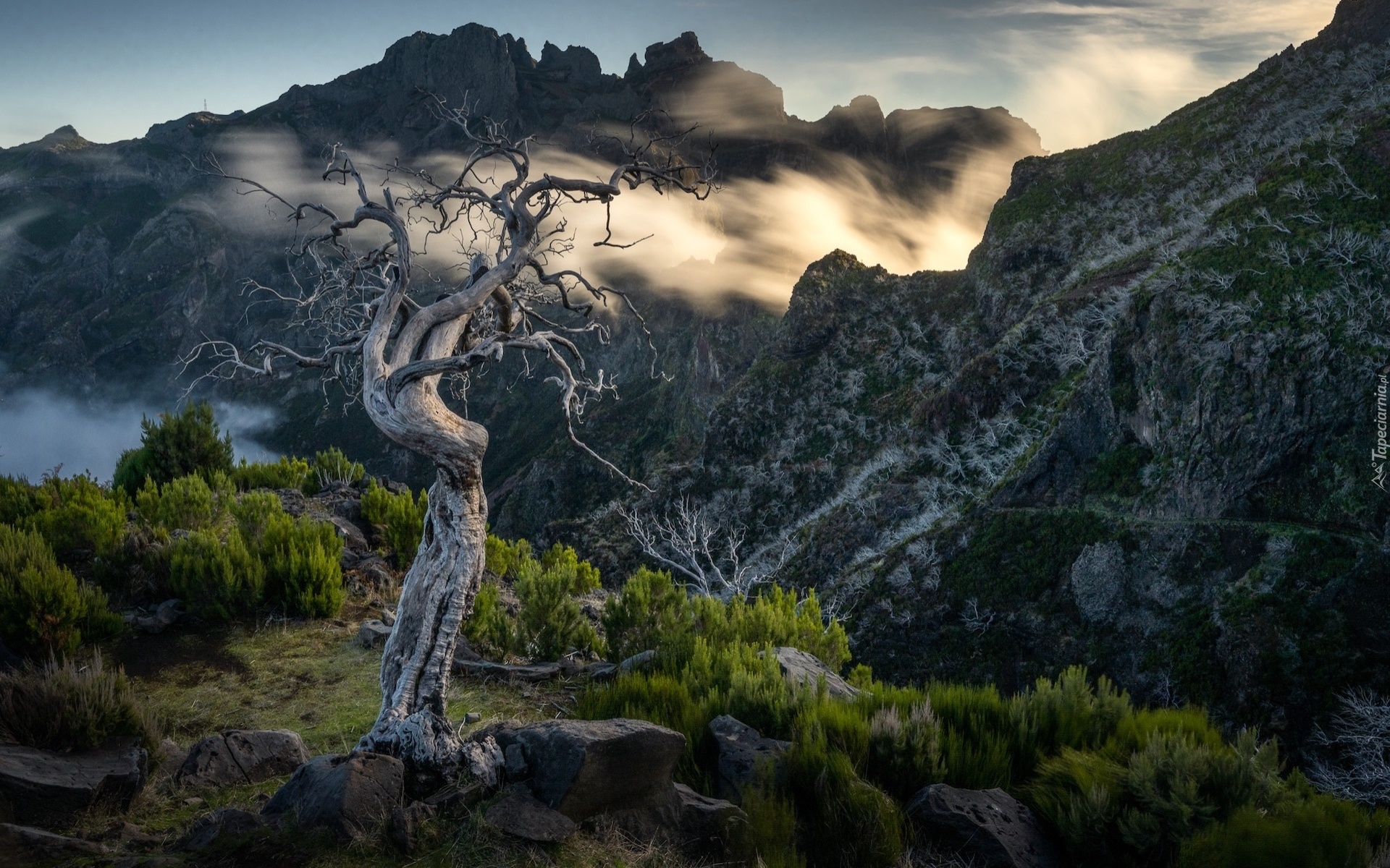 Edytor tapety: Uschnięte drzewo i mgła nad górami