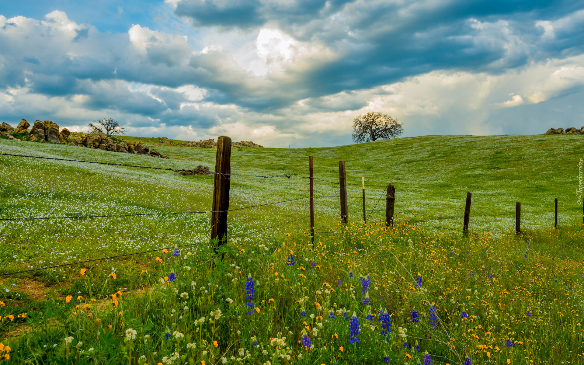 Edytor tapety: Ogrodzenie na ukwieconej łące