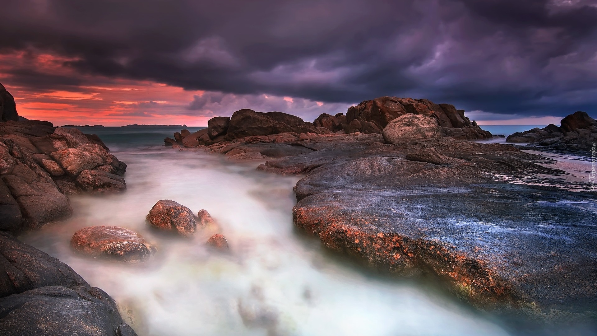Edytor tapety: Ciemne chmury nad skałami na wybrzeżu morza