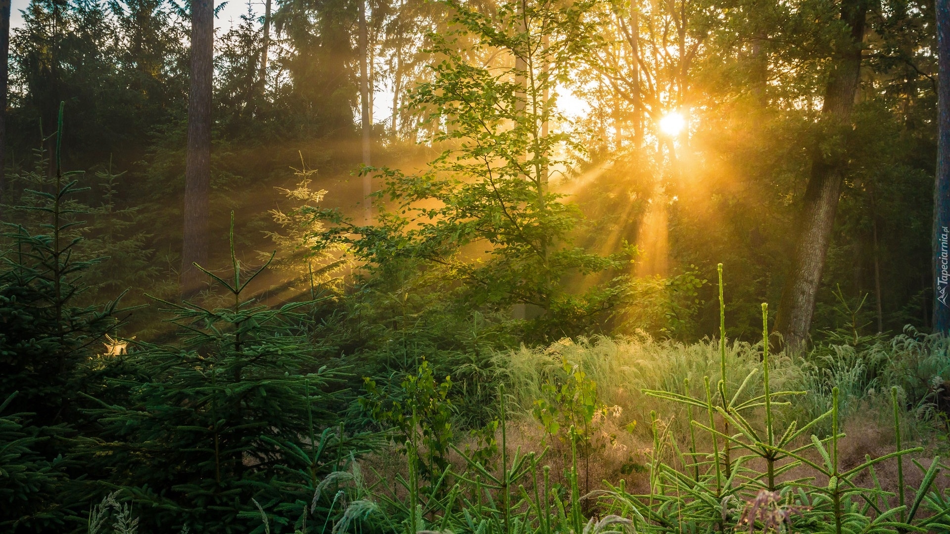 Edytor tapety: Przebijające wśród drzew promienie słońca w lesie