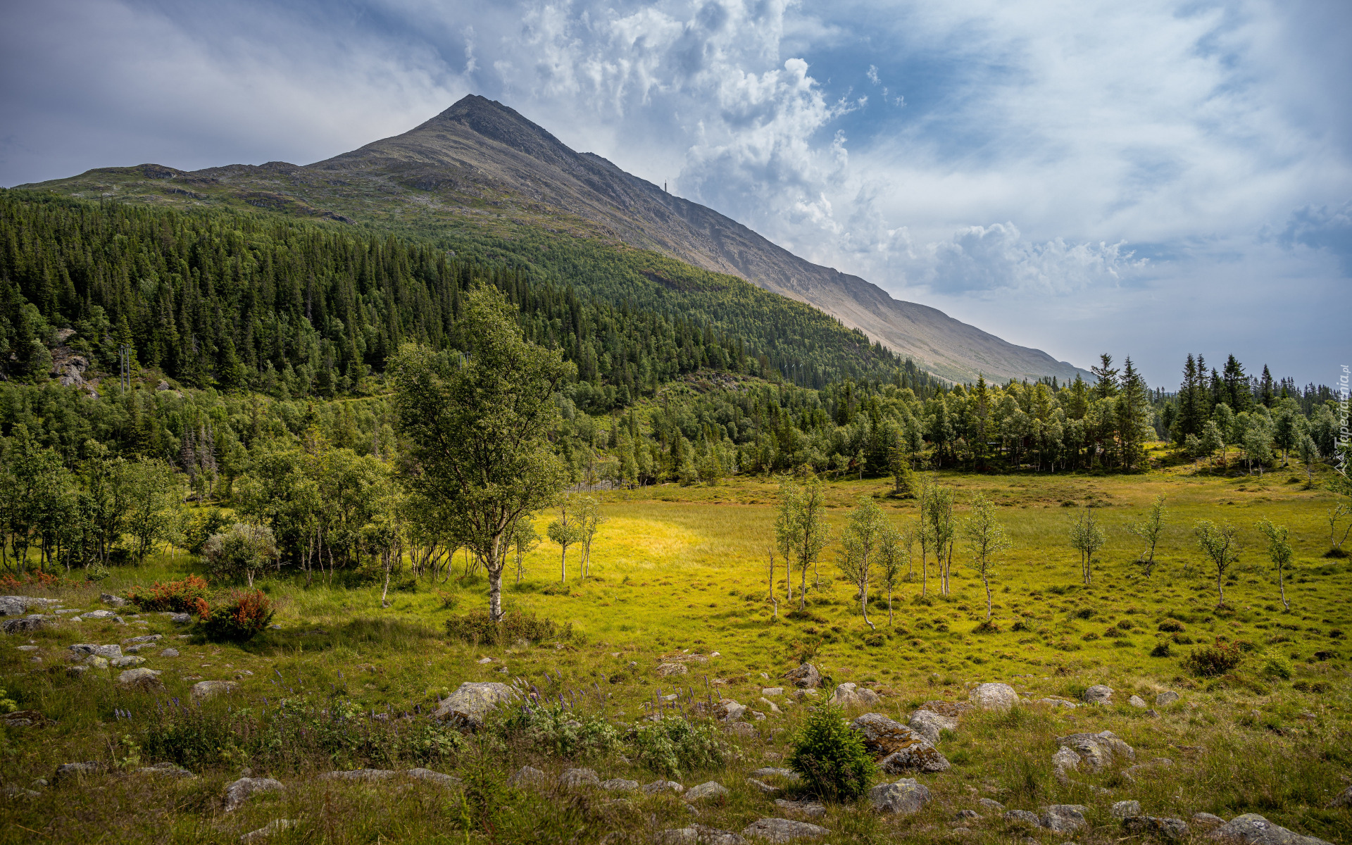 Edytor tapety: Drzewa na łące pod skalistymi górami