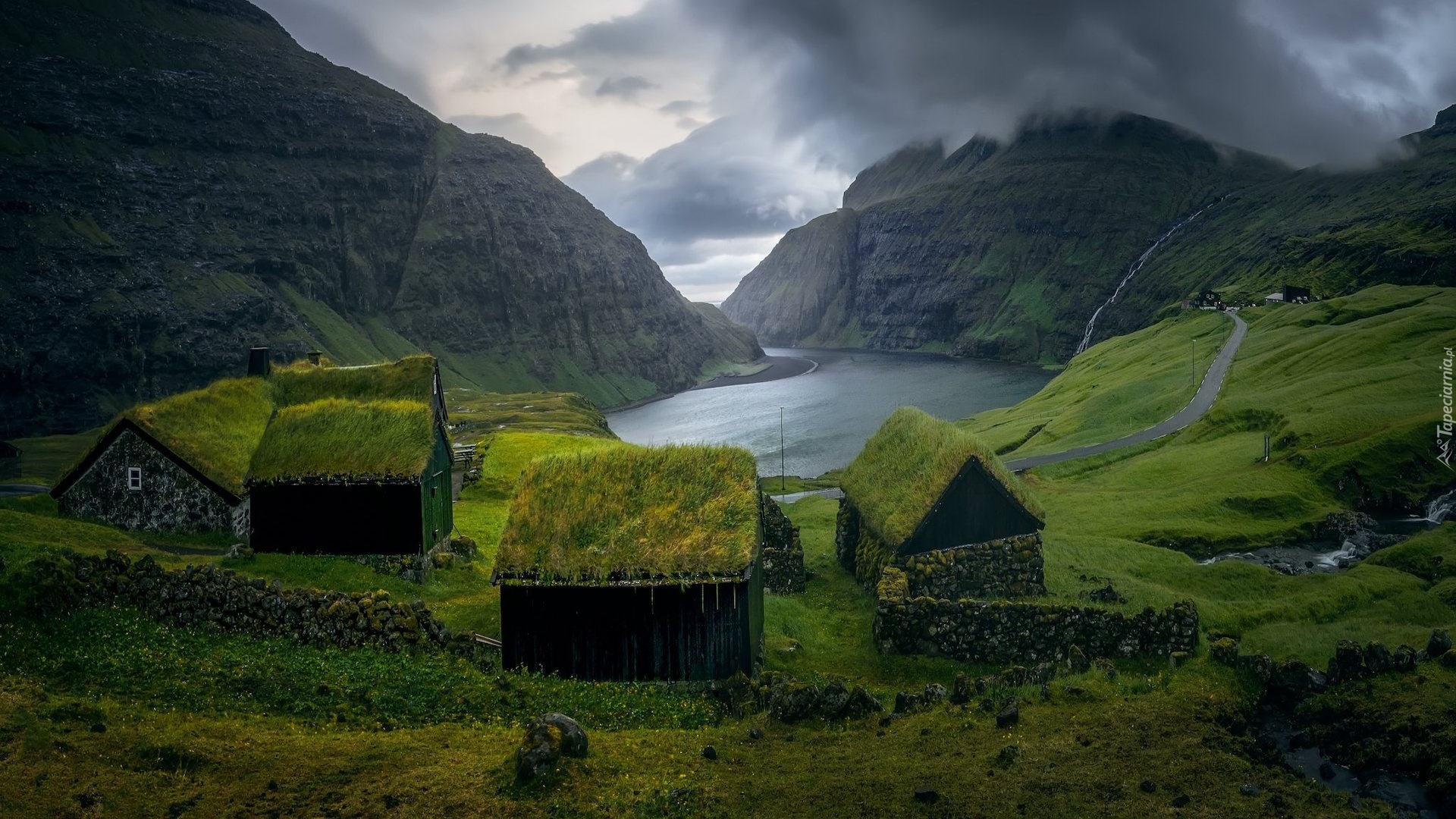 Edytor tapety: Domy na farmie Duvugardur nad jeziorem Laguna Pollurin