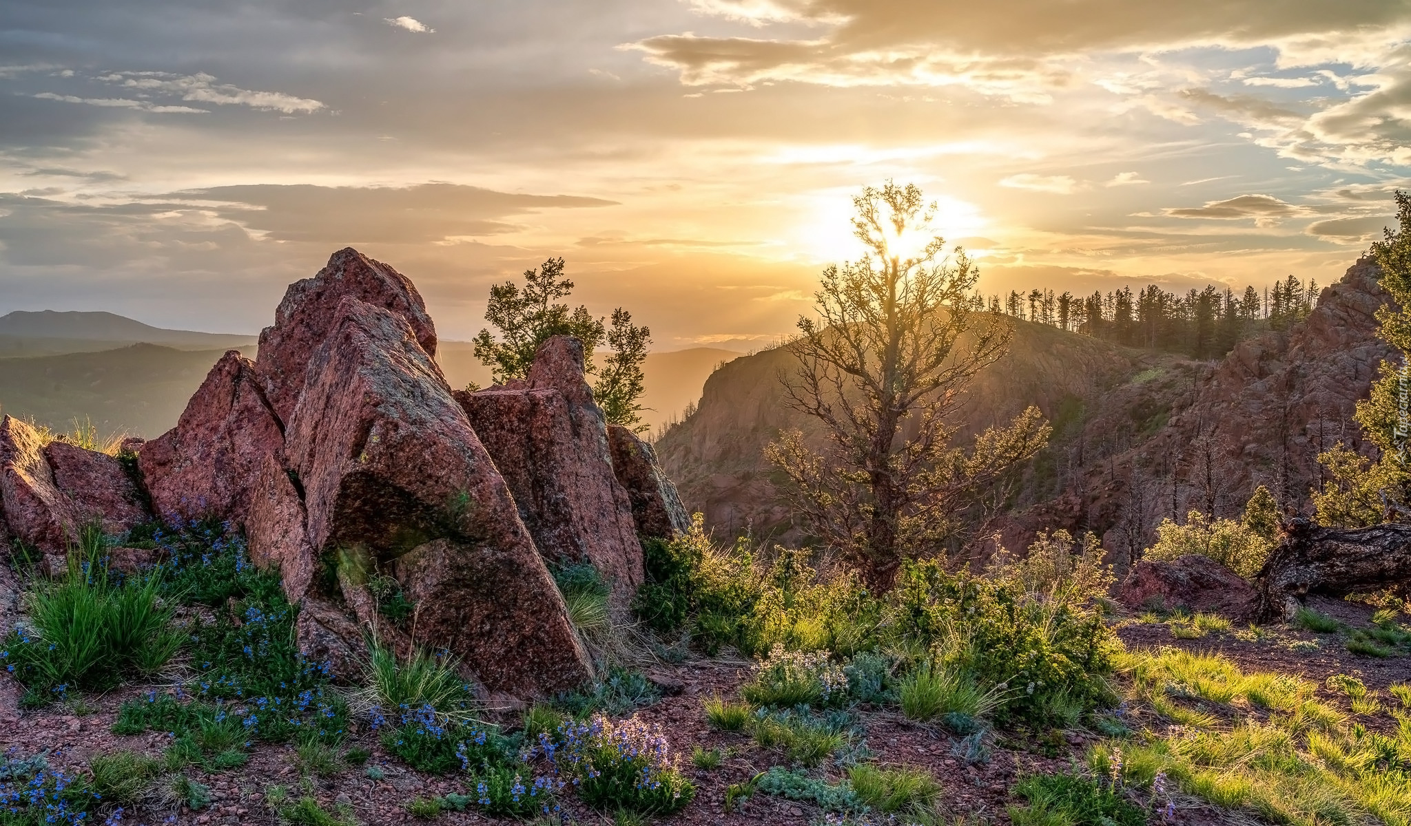 Edytor tapety: Skały i rośliny w blasku zachodzącego słońca