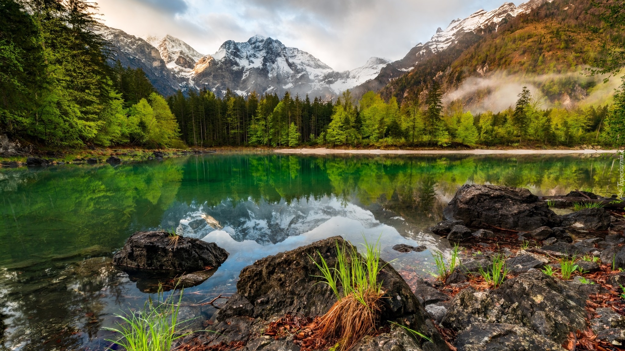 Edytor tapety: Kamienie i drzewa nad górskim jeziorem