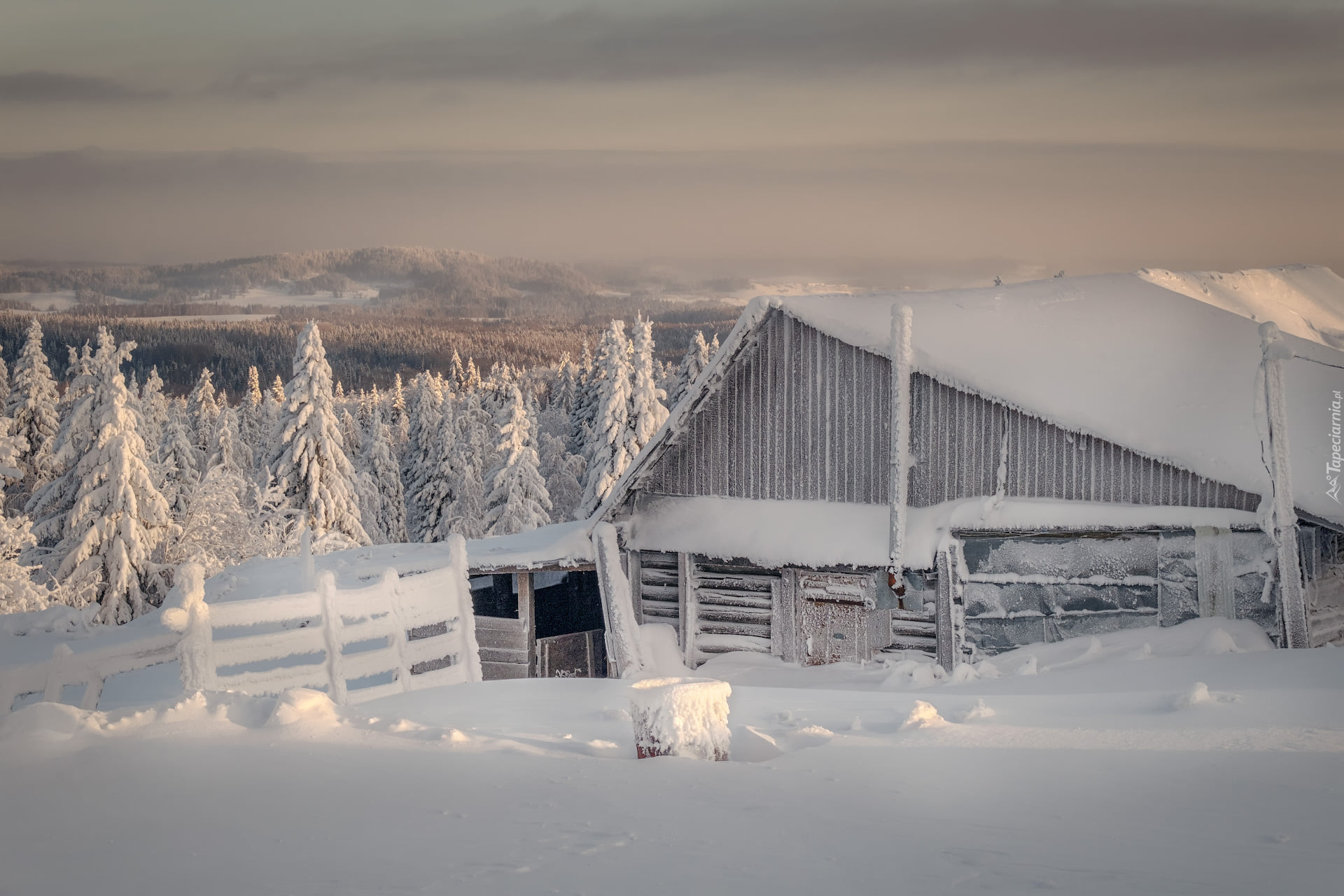 Edytor tapety: Zasypane śniegiem drzewa i drewniana szopa