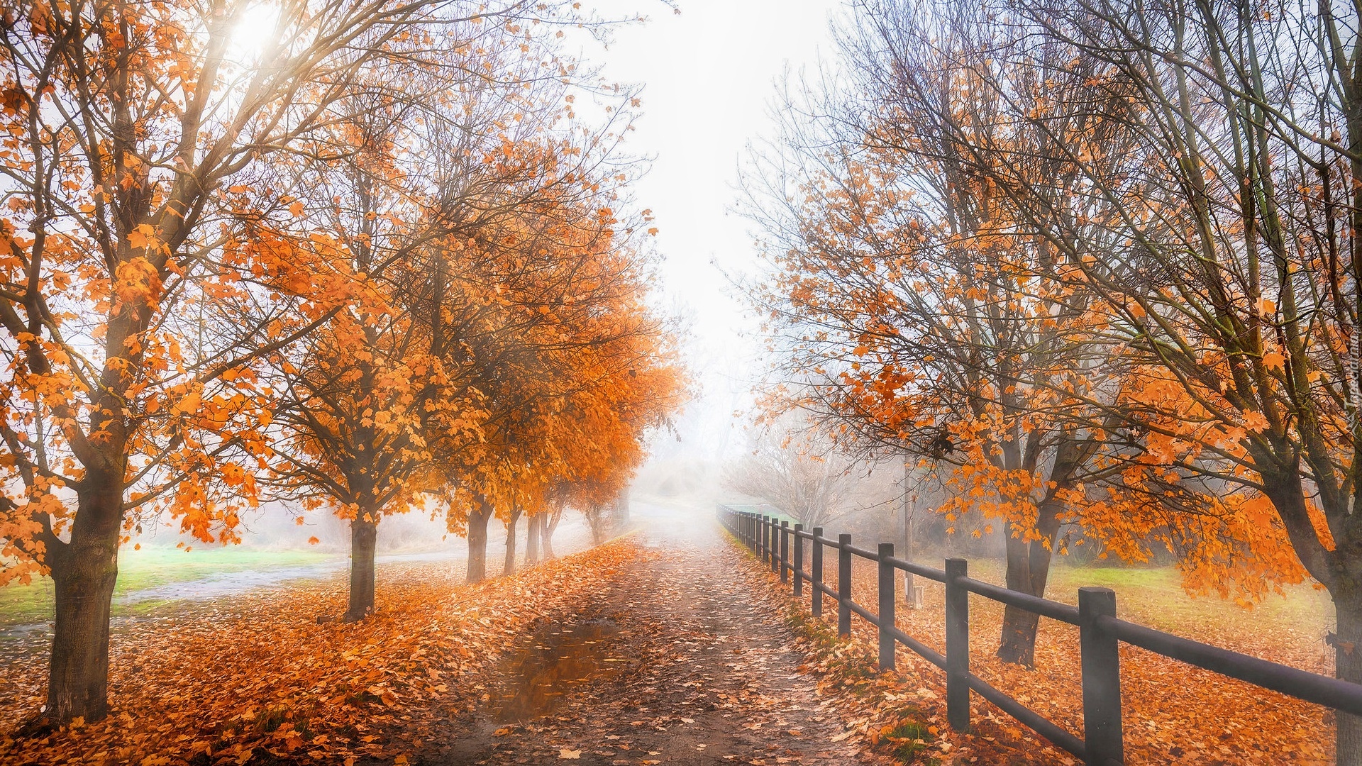 Edytor tapety: Jesienne drzewa i ogrodzenie przy drodze