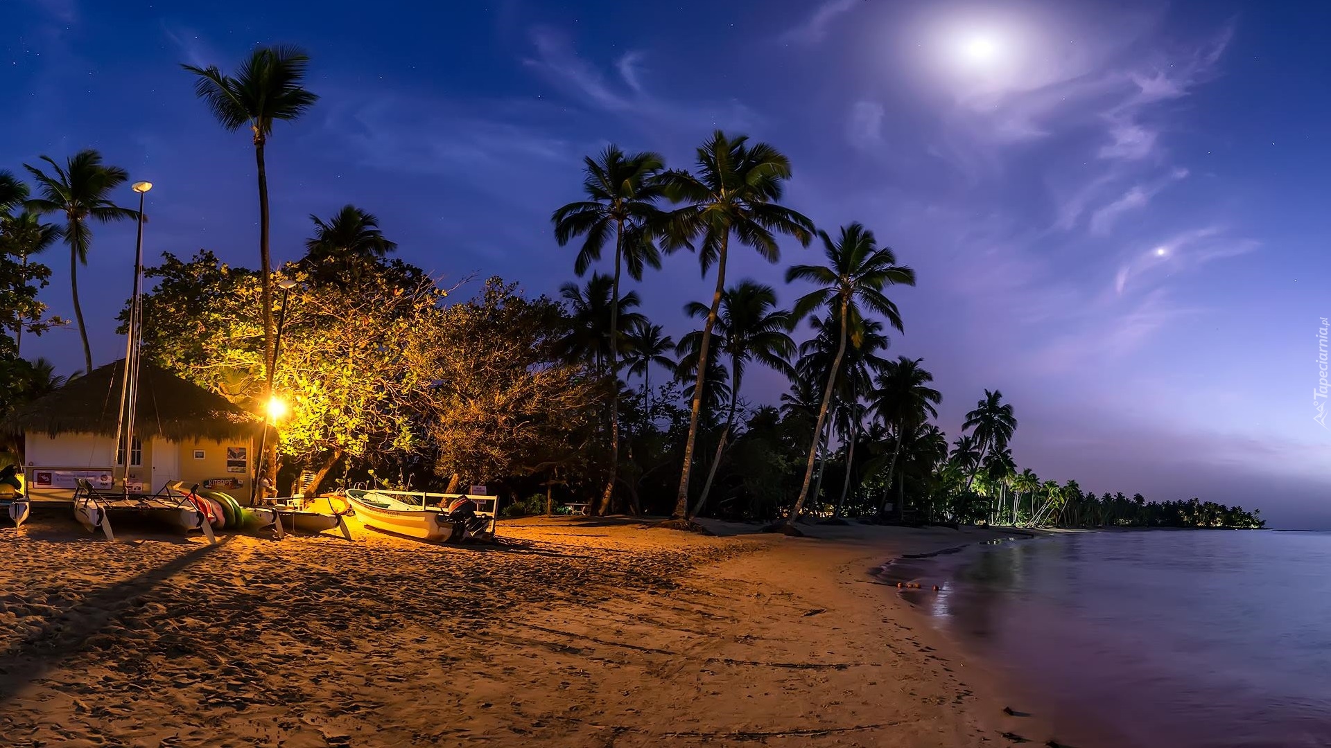 Edytor tapety: Łodzie obok domu pod palmami na plaży nocą