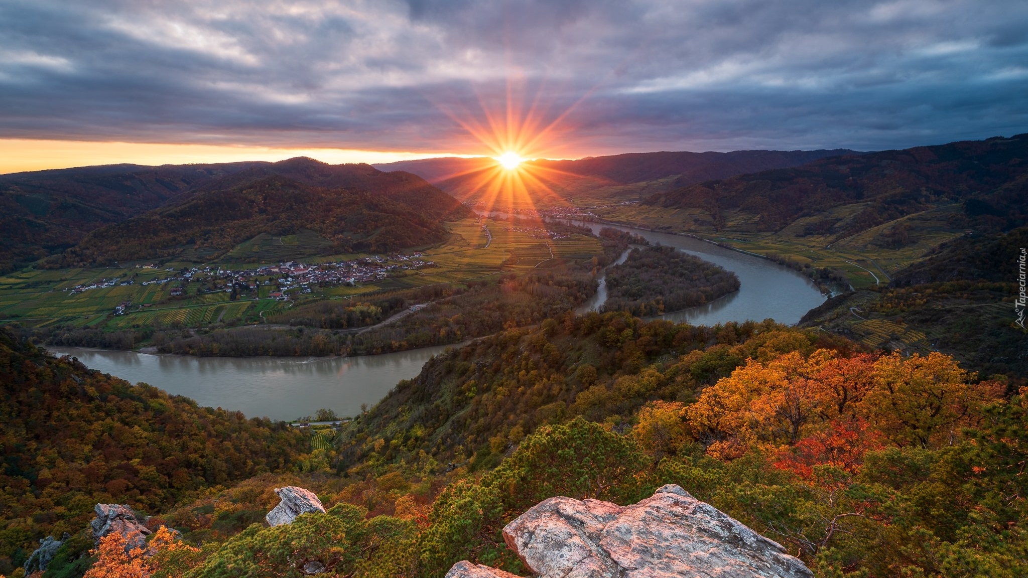 Edytor tapety: Zakole rzeki w promieniach zachodzącego słońca