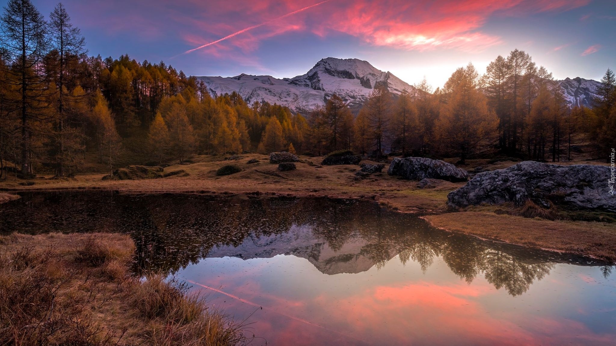 Edytor tapety: Pożółkłe drzewa nad stawem i góry w tle