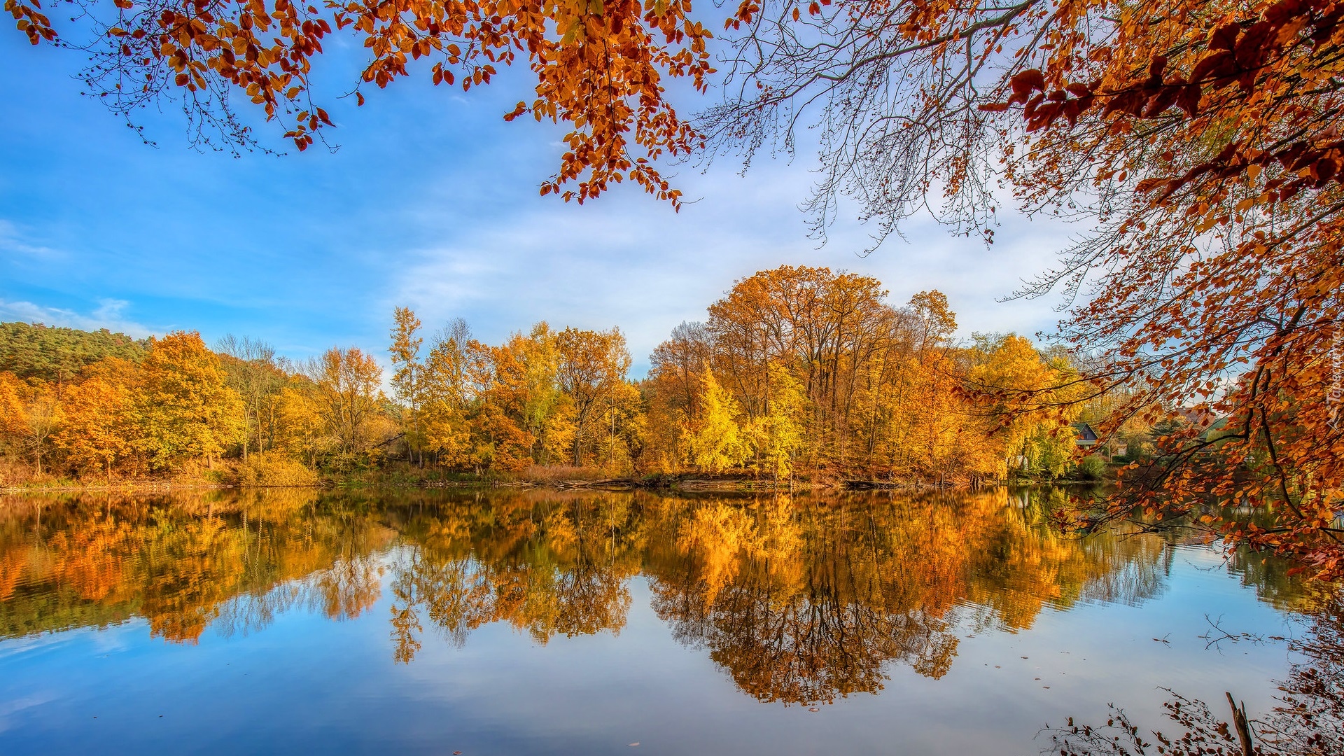 Edytor tapety: Rozświetlone słońcem pożółkłe drzewa nad jeziorem