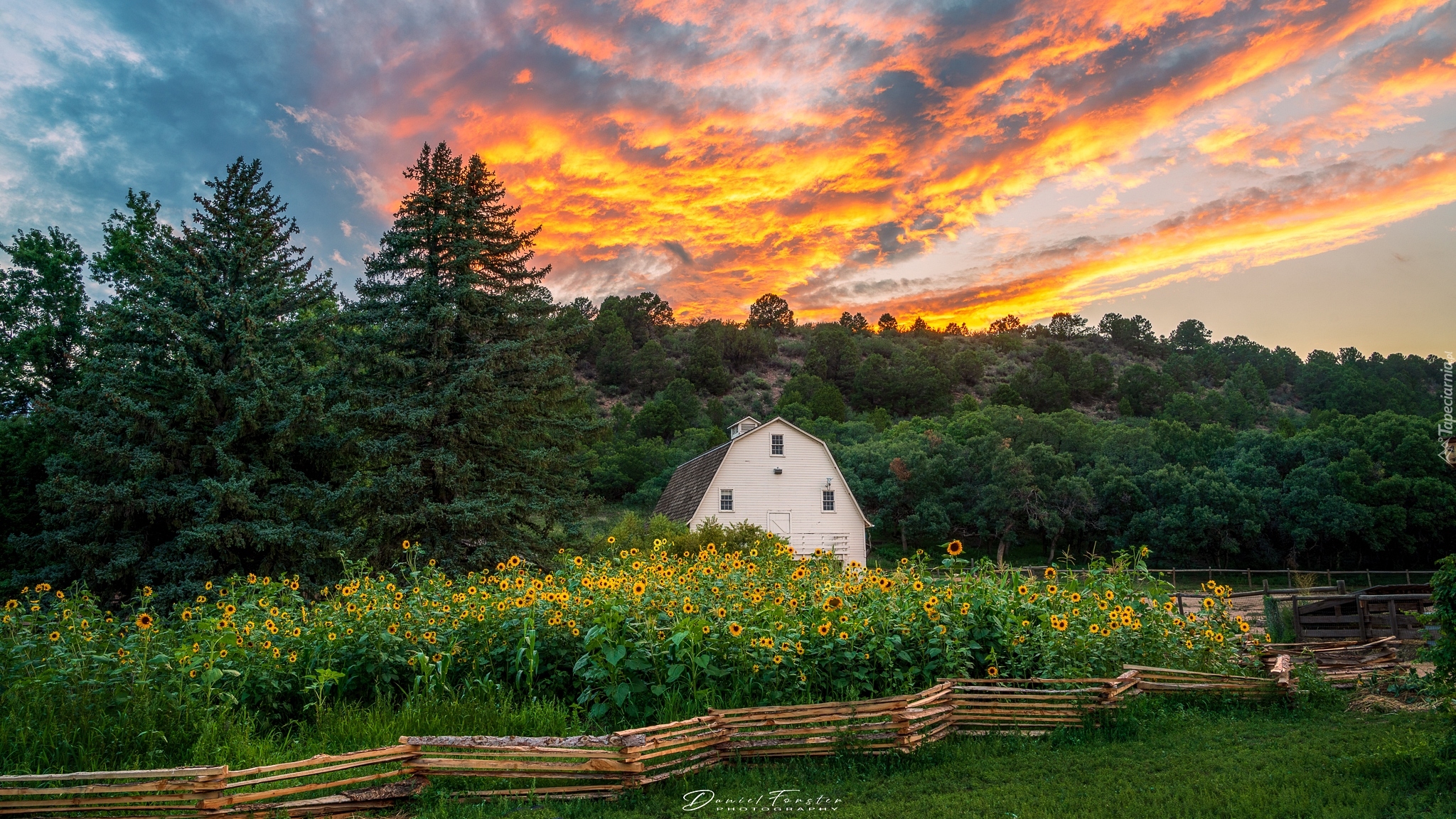 Edytor tapety: Ogrodzone pole słoneczników obok domu pod lasem