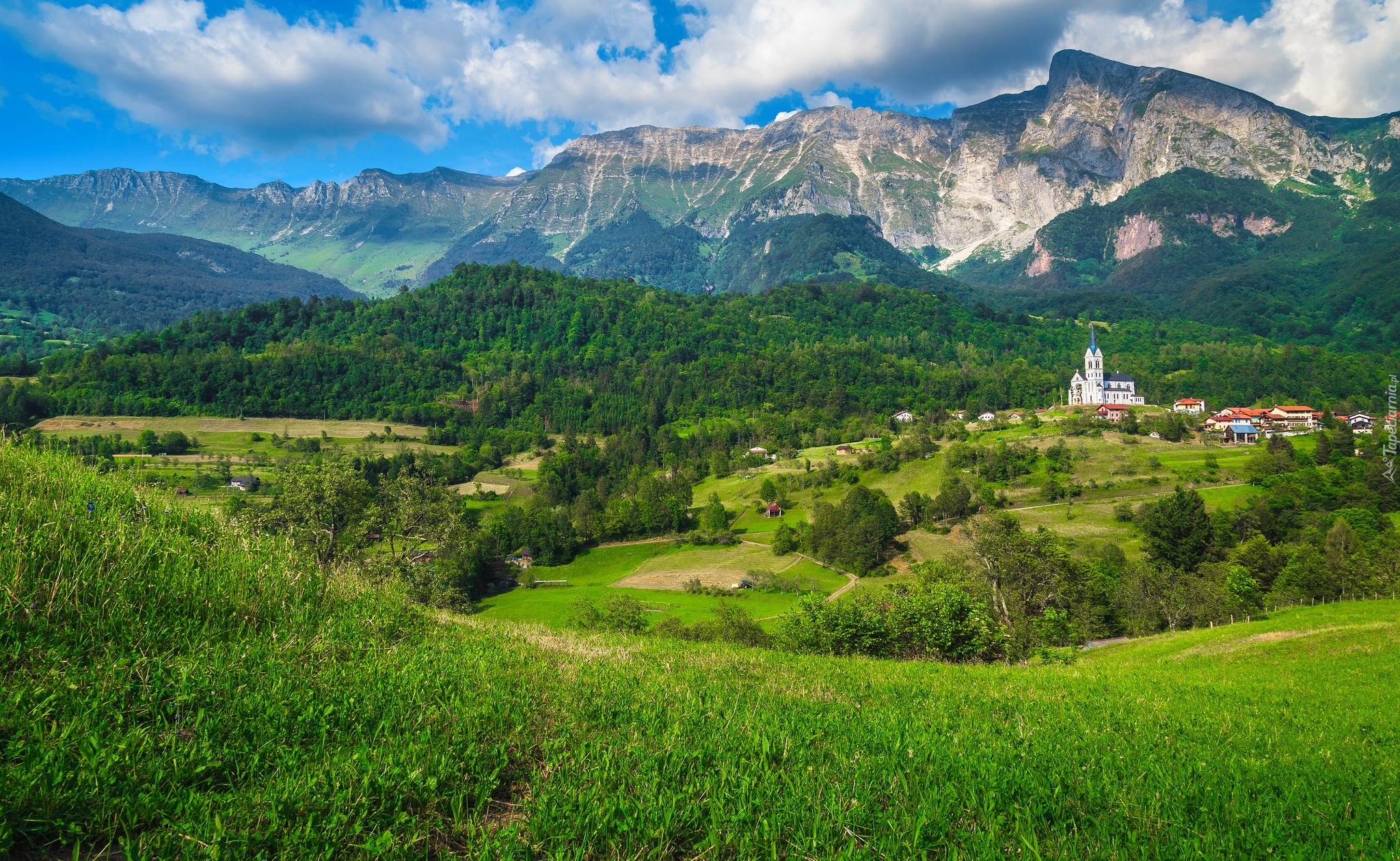 Edytor tapety: Kościół i domy we wsi Dreznica