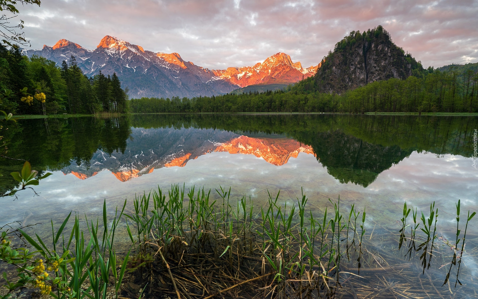 Edytor tapety: Odbicie rozświetlonych gór i lasów w jeziorze Almsee